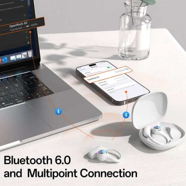 - OpenRock S2 оснащен новейшей версией Bluetooth 6.0 для быстрой передачи данных и мгновенного сопряжения. Поддерживает одновременное подключение к двум Bluetooth-устройствам с плавным переключением.