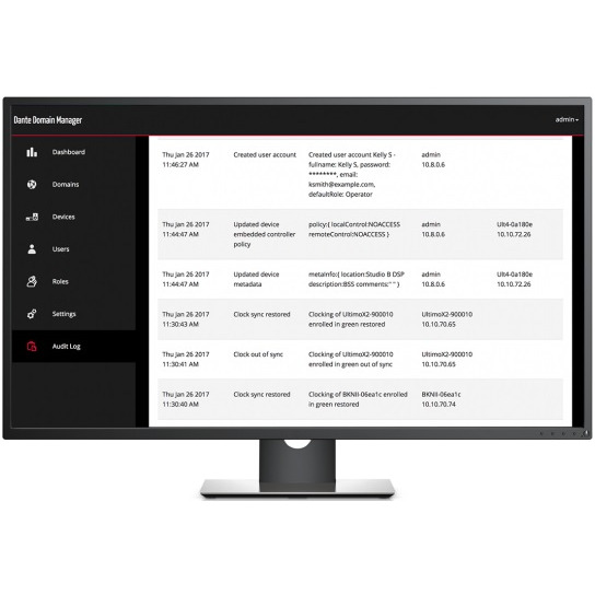 Dante Domain Manager обеспечивает надежную защиту для работы IT департаментов и AV-менеджеров и включает идентификацию пользователей и зашифрованный трафик управления системой, администрирование с использованием различных уровней доступа, а также интеграцию с Active Directory. Системные специалисты получают полный мониторинг работы системы, удобные настраиваемые панели информации, логи, уведомления и поддержку SNMP.