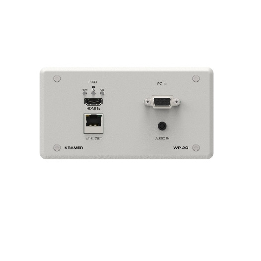 WP-20/EU(W)-86 – настенная панель-передатчик VGA/HDMI, RS-232 и стереоаудио по витой паре HDBaseT с поддержкой HDCP. Автоматическая коммутация источника, поддержка 4K/60 при цветовом поле 4:2:0. Расширенная работа с EDID-данными. Максимальная дистанция приема по кабелю витой пары категории 6a достигает 100 м при разрешении 4K, для разрешений 2K и 1080p увеличивается до 130 и 180 м соответственно. Может получать питание по PoE.