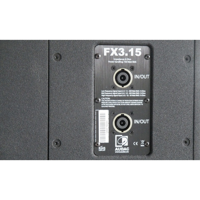 Audac FX3.15 - трехполосная корпусная акустическая система, оснащенная 15'' НЧ-динамиком, 6'' СЧ-головкой с неодимовым магнитом и ВЧ-динамиком c полимерным 1,75'' куполом. Рассчитана на работу в паре с пассивным сабвуфером FX1.18. Общая номинальная мощность 750 Вт RMS (пиковая – 1500 Вт). Чувствительность 105 дБ/Вт/м, уровень звукового давления 134 дБ/Вт/м. Диапазон частот 130 Гц – 20 кГц. Стальная перфорированная декоративная решетка, усиленный корпус из 18-мм березовой фанеры с влагоотталкивающим покрытием.