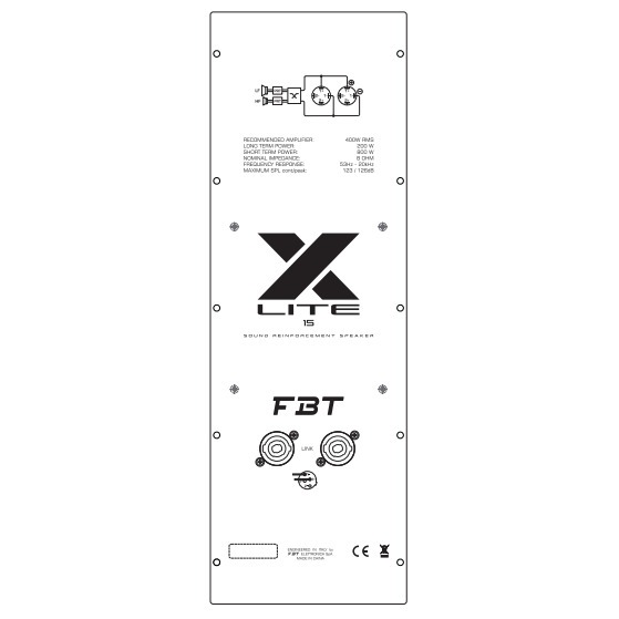 FBT X-LITE 15A - это новая 2-полосная акустическая система, выполненная в легком полипропиленовом корпусе. Встроенный усилитель класса D для низкочастотной составляющей (800 Вт RMS) и класса АВ для высокочастотной составляющей (200 Вт RMS) обеспечивает в общей сложности до 1000 Вт мощности. Воспроизведение звука осуществляется через один низкочастотный динамик 15" и один 1-дюймовый высокочастотный драйвер с 1.4" звуковой катушкой. Акустическая система обеспечивает до 128 дБ звукового давления. Для повышенного удобства использования предусмотрен встроенный DSP процессор обработки с 4 готовыми пресетами эквализации. Это значительно упрощает настройку звучания. Коммутационная панель представлена входным/выходным разъемами XLR, входами 1/4" Jack и RCA с регулировкой громкости. Предусмотрена кнопка переключения чувствительности микрофонного/линейного входа, кнопка среза низких частот для совместной работы с сабвуфером, а также селектор пресетов DSP (Original, Bass Boost, Smooth, Live). Стоит также обратить внимание на облегченный корпус, выполненный из литого полипропилена. Для удобства транспортировки и установки присутствуют специальные ручки, 35 мм разъем для вертикальной стойки и точки подвеса M10. Акустическая система может использоваться в качестве сценического монитора под углом 35 или 45 градусов.