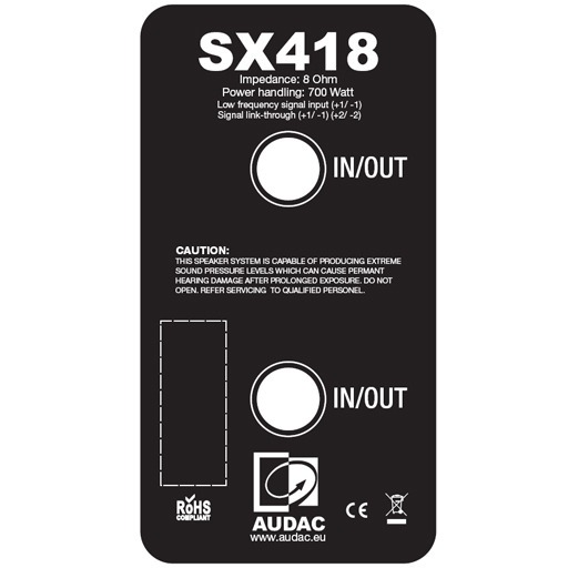 Audac SX418W - сабвуфер с одним 18" НЧ динамиком мощностью 700 Вт RMS. Чувствительность устройства - 100 дБ. При максимальном звуковом давлении в 129 дБ частотная характеристика в диапазоне от 35 до 250 Гц очень ровная. Соединения осуществляются при помощи разъемов Neutrik Speakon, также возможно соединять между собой несколько SX418/W. Впечатляющее сочетание четкости, воспроизведения очень низких частот и точности достигается за счет 18" высокоамплитудного диффузора с его очень мощным счетверенным магнитом. Внутри колонки создается высокое давление, поэтому в ней смонтирован упрочняющий каркас. Белого цвета.