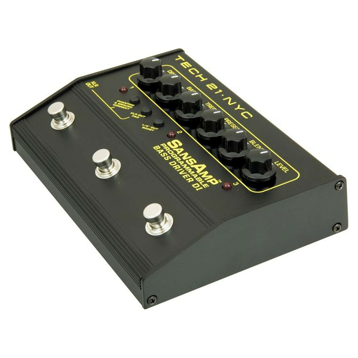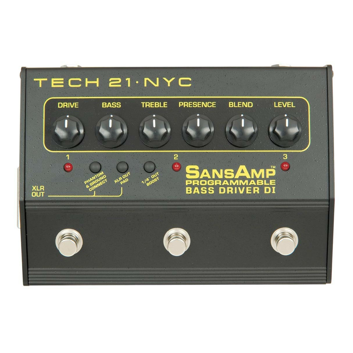 TECH 21 PBDR - басовый предусилитель Programmable SansAmp Bass Driver DI имеет возможность сохранения и быстрого вызова трех пэтчей. Есть регулятор чувствительности, двухполосный эквалайзер, регулятор Presence, регулятор баланса исходного и обработанного звука, регулятор громкости, вход и выход на джеках, симметричный выход (XLR), три переключателя режима работы, три металлические кнопки для сохранения и вызова настроек, три светодиодных индикатора текущего пэтча. Питание осуществляется от девятивольтовой батарейки, адаптера или фантомным напряжением.