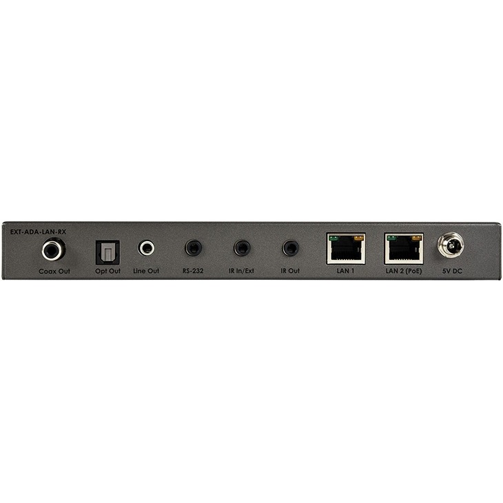 EXT-ADA-LAN-RX – приемник сигналов RS-232 (miniJack 3,5 мм), аналогового (miniJack 3,5 мм) и цифрового аудио (TOSLINK и RCA), двунаправленных сигналов ИК из IP-сетей 1000BaseT (2xRJ45), который принимает высококачественные сигналы по стандартным линиям категории 5е, 6. Питание устройства может осуществляться по PoE. Используемые сетевые IP-коммутаторы должны поддерживать Jumbo-кадры (8 Кбит или больше) и IGMP (для совместимости с графическими приемопередатчиками). Управление устройством осуществляется с помощью встроенного web-интерфейса, по Telnet и UDP. Приемники EXT-ADA-LAN-RX и совместимые с ними передатчики EXT-ADA-LAN-TX могут объединяться в «виртуальную матрицу» с участием 65000 устройств. Для физического управления коммутацией подходит устройство EXT-CU-LAN.