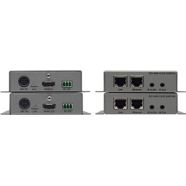 EXT-UHD-CAT5-ELRPOL – комплект устройств для передачи сигналов HDMI 4Kх2K 3D, RS-232, Ethernet и двунаправленных сигналов ИК-управления по витой паре HDBaseT. Используется один кабель категории 5е или выше. Поддерживаются сигналы до 3840x2160 / 4096х2160, 1080p Full HD (дальность передачи до 100 и 150 м соответственно), встроенное цифровое аудио без потерь до 7.1, 3DTV, CEC, EDID, HDCP, PoL.