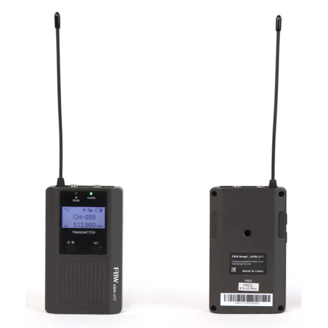 Одноканальный компактный радиопередатчик FBW AWM-U1T является устройством принимающим аудиосигналы от подключенного микрофона с целью передачи его по радиоканалу на приемник накамерной радиосистемы AWM-U1R. UHF диапазон несущих частот 512 - 537 МГц.