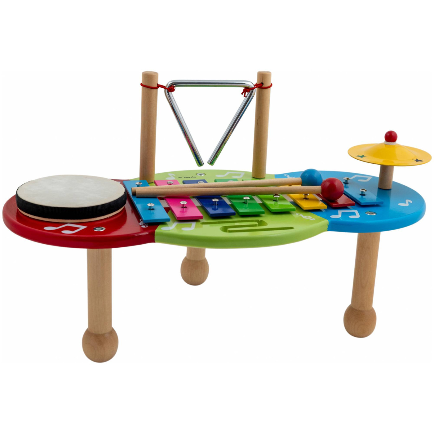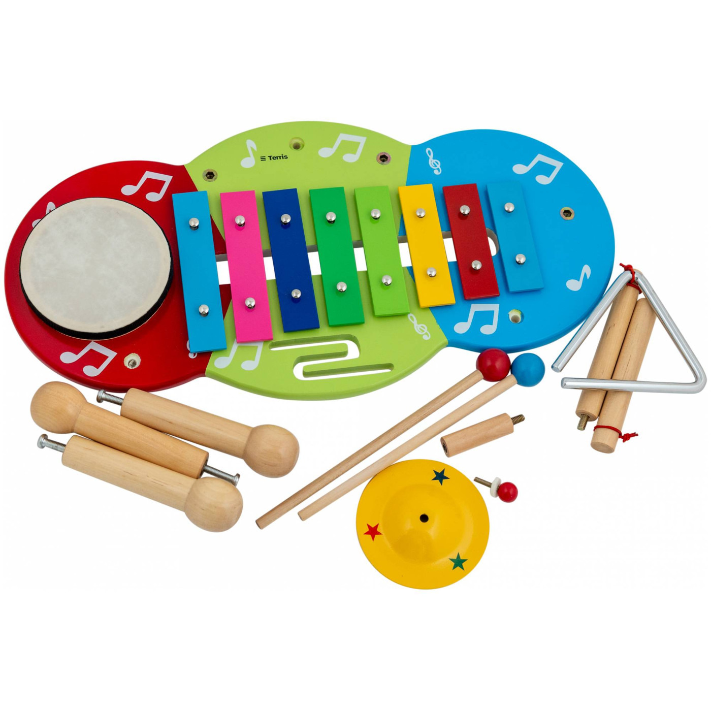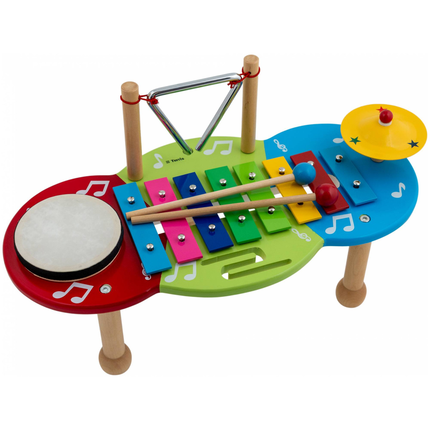 В комплект входят металлофон с 8 цветными нотами и двумя деревянными палочками, треугольник на держателе с палочкой, тамбурин и тарелка. Этот набор отлично подходит для знакомства детей с миром музыки и ритма, развивая слух и координацию.