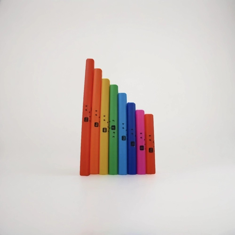 Каждая трубка окрашена в свой цвет, что облегчает визуальное распознавание нот. Набор позволяет играть мелодии и разнообразные ритмические рисунки