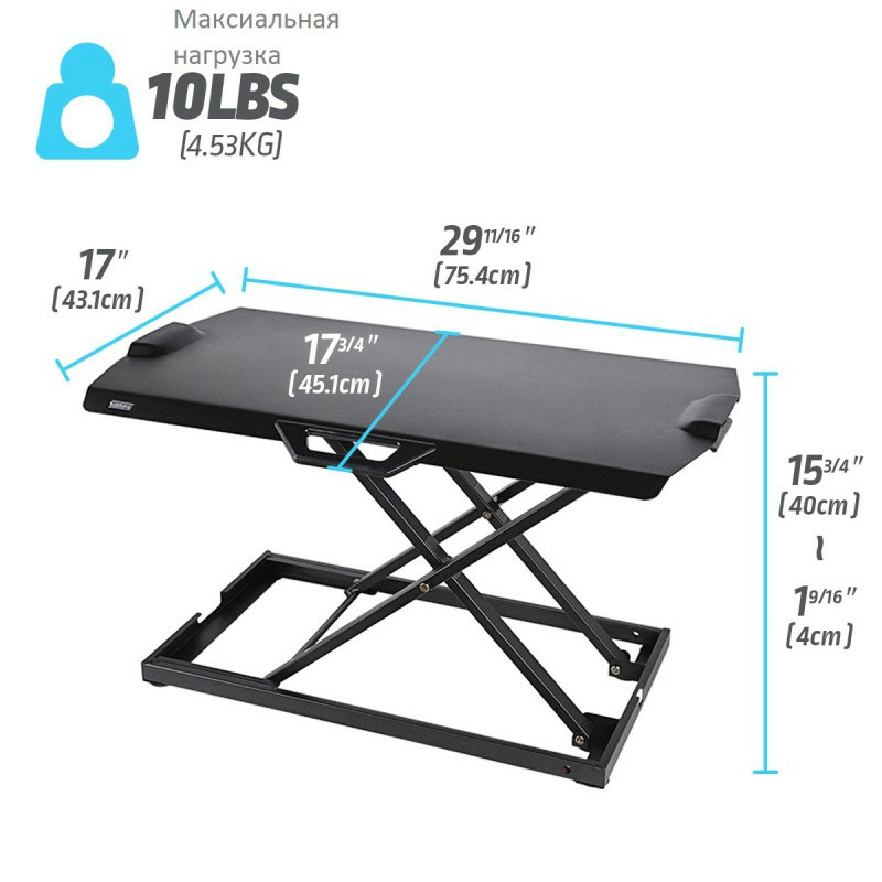 - Размеры стола: Высота мин -3,8 см; Высота макс -40,6 см; Глубина столешницы 45 cм; Ширина столешницы 76,2 см.