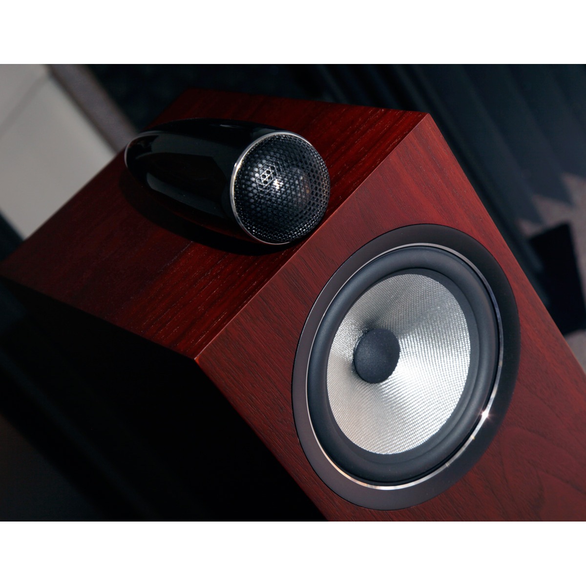 Модель способна передать тончайшие нюансы музыкального произведения. Такие возможности обеспечивает новый твитер сложной конструкции с жесткой карбоновой купольной мембраной. Излучатель помещен в обтекаемый корпус-футляр, напоминающий форму пули и закрепленный на верхней панели колонки. Такой миниатюрный корпус, изготовленный из алюминия, весит чуть более одного килограмма и обладает превосходной акустической инертностью. Частота первого резонанса твитера смещена до отметки в 47 кГц. Благодаря высоким техническим характеристикам и широкой полосе пропускания такой динамик способен легко справиться с воспроизведением требовательных аудио-форматов высокого разрешения. Компания B&W указывает на то, что данный излучатель значительно превосходит по своим показателям использовавшиеся ранее твитеры с двойными алюминиевыми куполами.