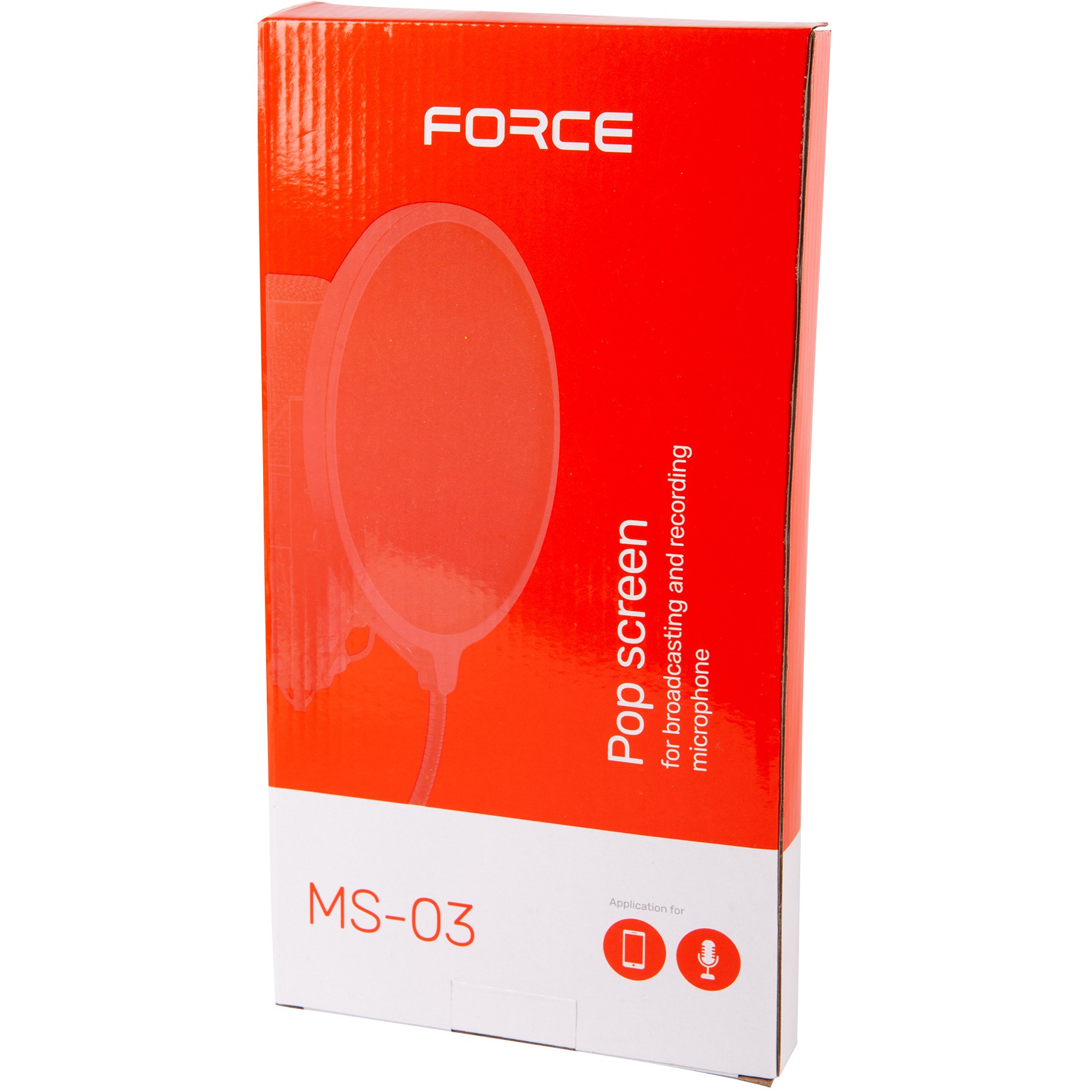 Force MS-03 качественная и очень доступная ветрозащита (поп-фильтр), использующаяся для работы на студии. Модель имеет гибкий держатель типа гусиная шея (34 см), позволяющий принимать любое пространственное положение. Закрепление на стойке производится при помощи винтовой струбцины, не требующей использования специального инструмента (затягивается руками). Достаточно большой диаметр поп-фильтра (15,5 см) открывает возможность работы с большинством видов микрофонов. Экран изготовлен из двойной мембраны (капрон) , имеет пластиковый каркас. Цвет черный, цветная упаковка.