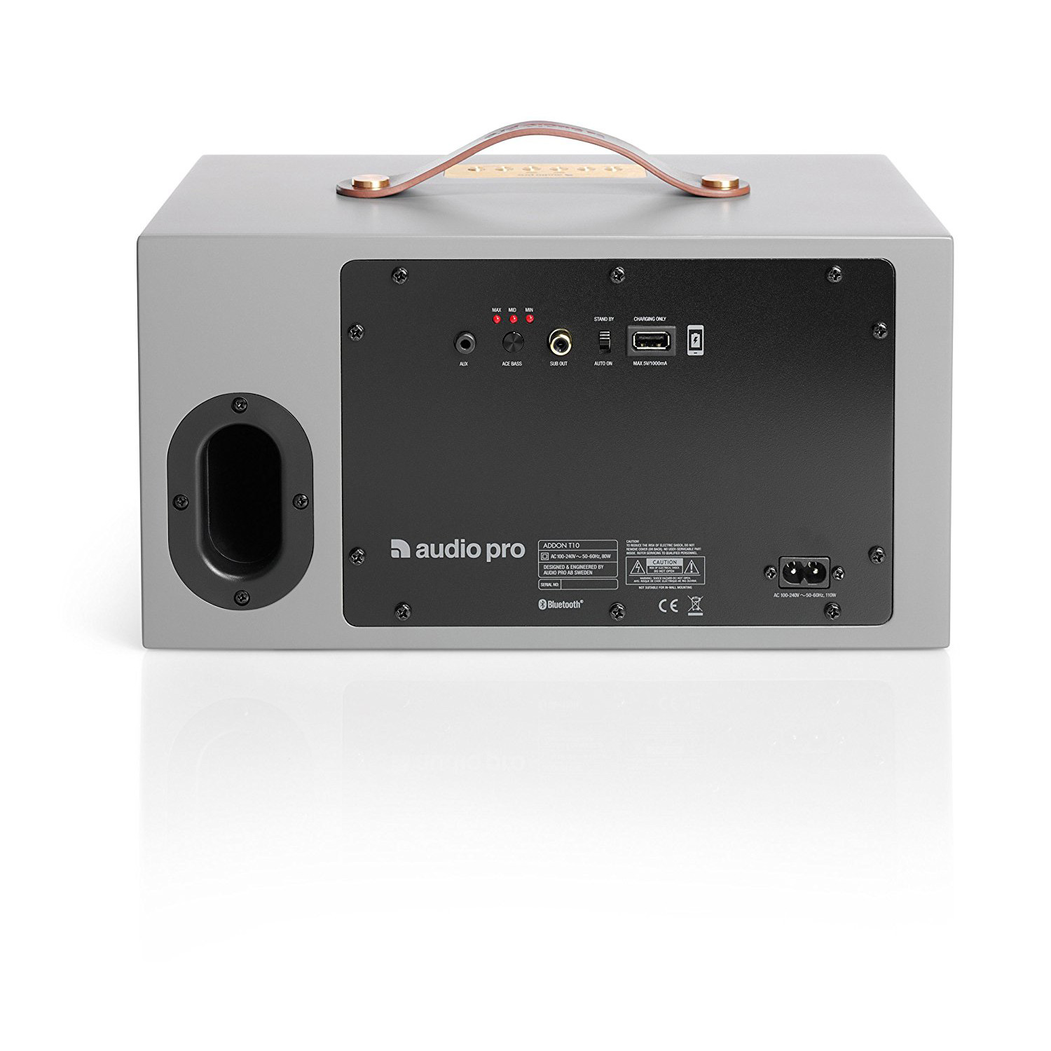 Помимо основного динамика, они раскачивают два твитера с мягкими куполами диаметром 19 мм, прикрытыми несъемными металлическими решетками. Частота раздела между полосами установлена на 2500 Гц. Акустическое оформление – фазоинвертор, овальный порт которого выведен на заднюю панель. На ней также находится порт Ethernet для проводного подключения к сети, плюс линейный аналоговый вход на RCA. Расположенный рядом с ними порт USB предназначен исключительно для зарядки смартфонов или планшетов, а монофонический аналоговый выход предполагает подключение внешнего активного сабвуфера, например, фирменного Addon C-SUB.