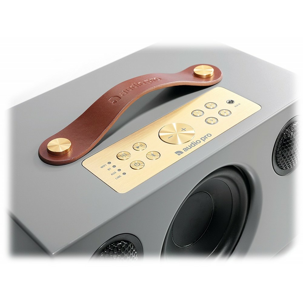 Верхняя панель отведена под органы управления, с их помощью можно переключаться между разными источниками сигнала, регулировать громкость, а также запускать и останавливать воспроизведение. На ней же расположен и вход мини-джек 3,5 мм. Однако полноценное управление всеми функциями колонки лучше осуществлять при помощи фирменного мобильного приложения от Audio Pro. Рядом с металлической площадкой находится ручка для переноски из натуральной кожи. Поскольку на поверхности корпуса моментально остаются следы пальцев владельца, буде он решит взять ее в руки, перемещать колонку лучше за эту ручку.