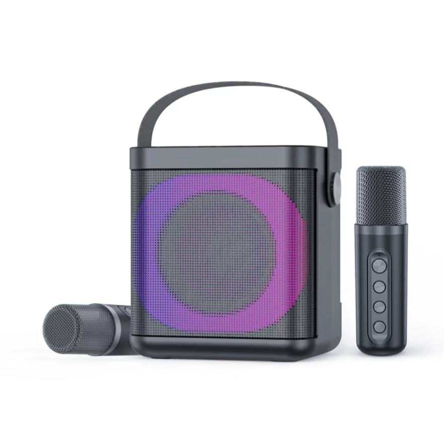 iconBIT K702B - Bluetooth колонка с двумя беспроводными микрофонами и функцией караоке. Подключение колонки к смартфону или другим устройствам осуществляется с помощью Bluetooth или аудио кабеля. Беспроводные микрофоны подключаются к колонке автоматически. K702B обеспечивает чистое и громкое звучание голоса и музыки, а RGB подсветка создаст удивительную атмосферу.