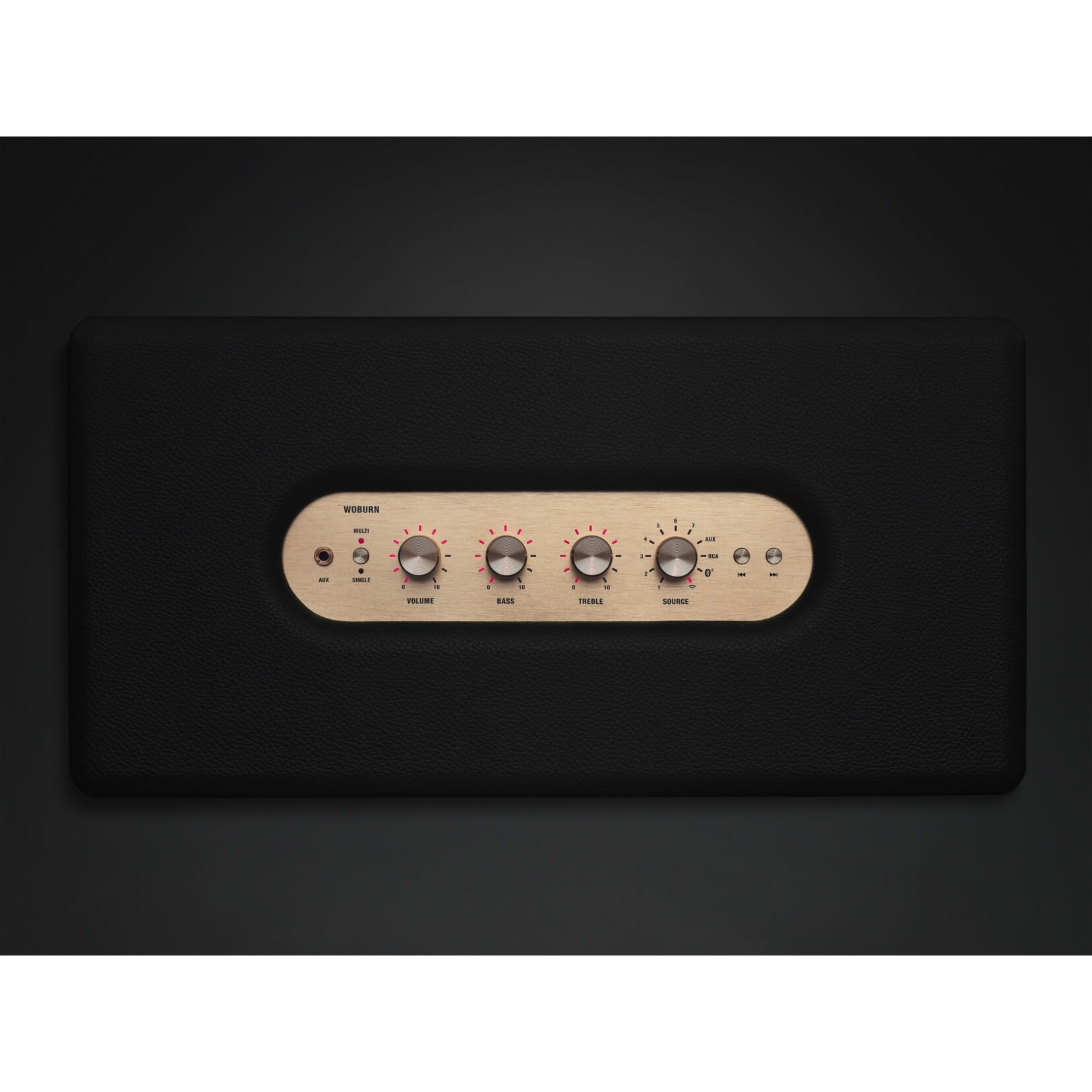 Блок управления расположен на верхней панели колонки, при этом рукоятки регуляторов громкости и сама вставка выполнены из металла. Marshall Woburn Multi-Room имеет два линейных входа на разъемах RCA и mini-jack, а также возможности беспроводного подключения по Wi-Fi и Bluetooth. При этом система имеет расширенные возможности по воспроизведению музыки по сети, которые обеспечиваются за счет поддержки сервиса Spotify и технологии Chromecast. С помощью переключателя на передней панели можно выбрать одну из семи сохраненных в памяти настроек на интернет-ресурсы – плейлист в Spotify, интернет-радиостанцию, подкаст. Прямое подключение мобильных устройств возможно с использованием Bluetooth, также имеется поддержка и AirPlay.