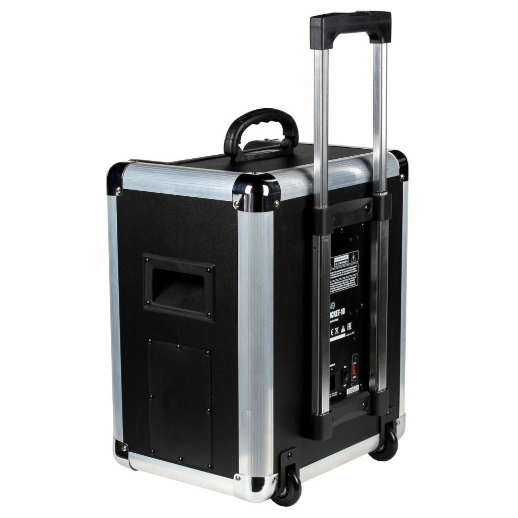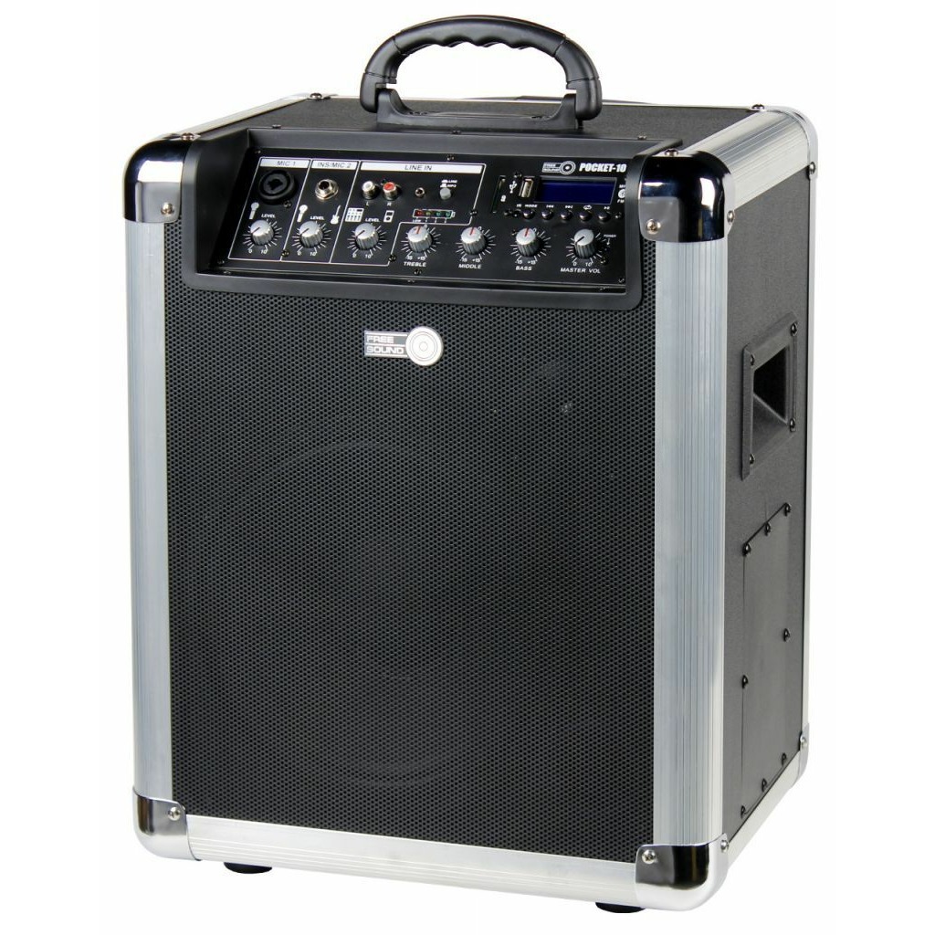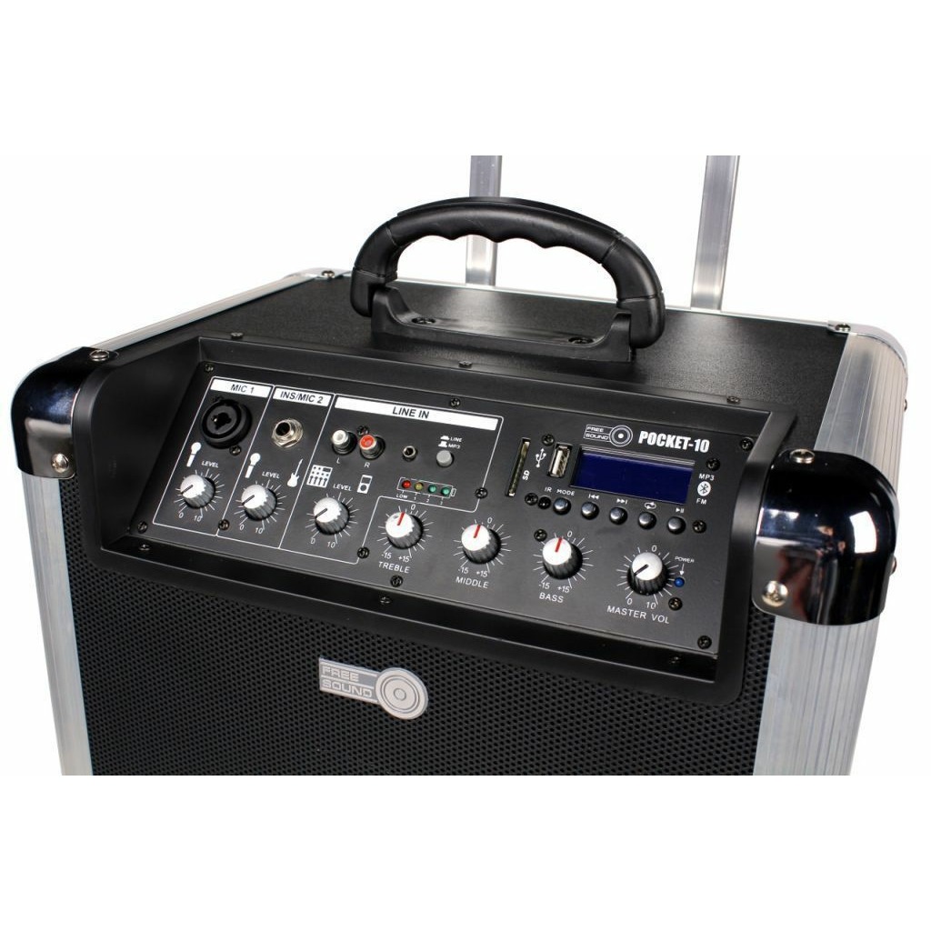 Free Sound POCKET-10 - портативная акустическая система с питанием от встроенного аккумулятора с множеством возможностей, среди которых MP3-проигрыватель с USB и SD слотом, BLUETOOTH-проигрыватель, а также встроенный микшерный пульт. Микшерный пульт имеет 1 комбинированный XLR/TRS микрофонный вход, 1 низкоимпедансный инструментальный вход, 1 стерео вход с разъемами RCA x 2 и мини джеком для подключения линейных стерео источников, таких как портативные плееры, смартфоны и т.д. Портативная акустическая система Free Sound POCKET-10 имеет прочный корпус из MDF с отделкой из ПВХ, имеющий выдвижную телескопическую ручку и колеса для удобной транспортировки. Для защиты корпус снабжен усиливающими уголками.