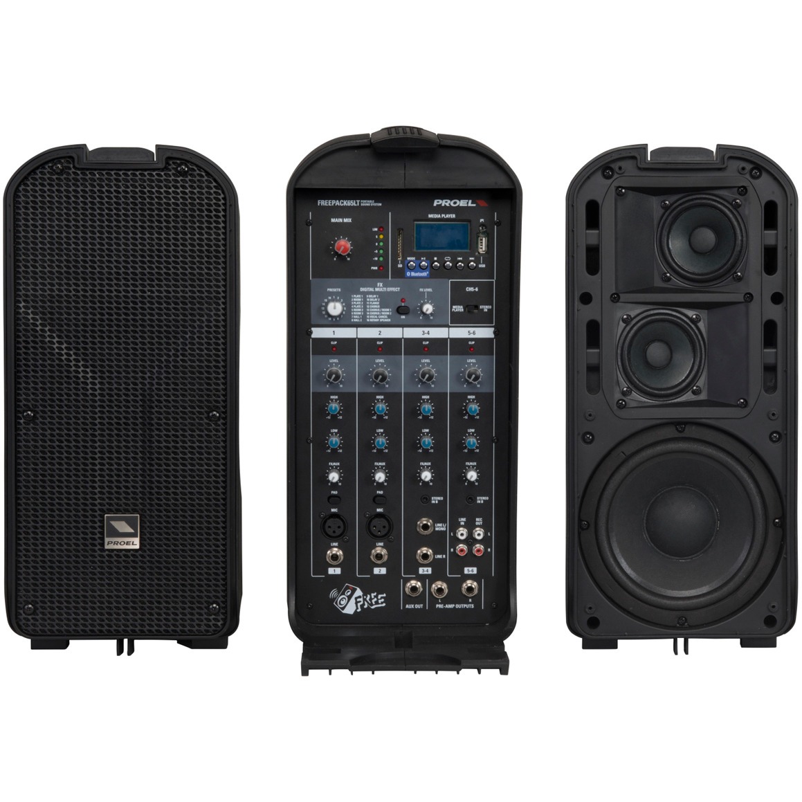 ProelFREEPACK65 - ультра-портативный звуковой комплект "All-In-One", включающий в себя полнофункциональный пульт с цифровым блоком эффектов, медиа-плеер, мощный усилитель, две акустические системы и соединительные кабели. FREEPACK65 является полной PA системой, которая несмотря на компактные размеры, обладает полным набором необходимых функций и обеспечивает неожиданное качество звука для такого рода систем.