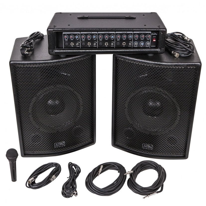 Мобильный звуковой комплект общей мощностью 200 Вт состоящий из микшерного пульта со встроенным усилителем, акустических систем с 10" динамиками и пьезо твитером. В комплект поставки так же входят две акустические стойки под АС, динамический микрофон с кабелем 5 метров и два акустических кабеля Jack-Jack длиной по 10 метров каждый.