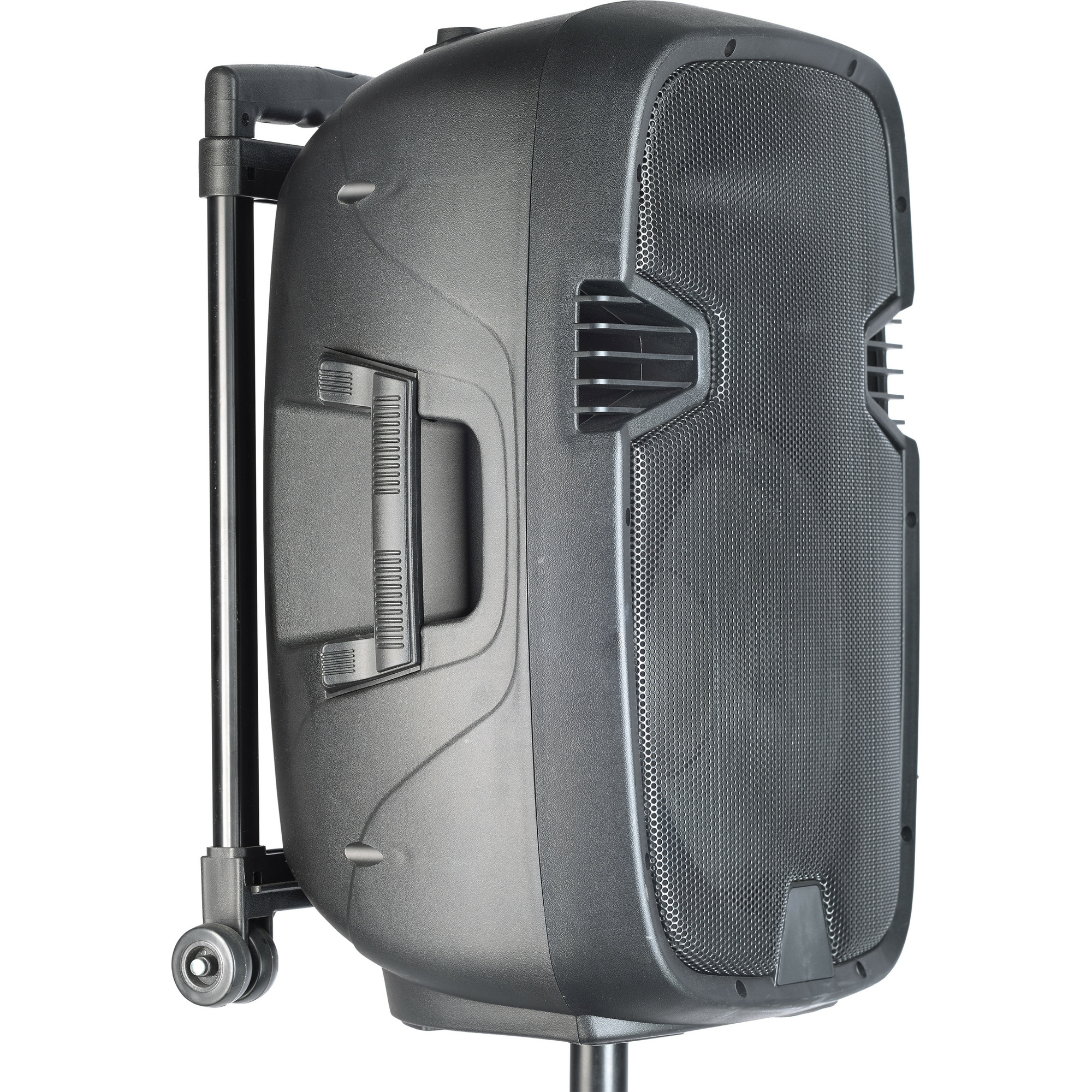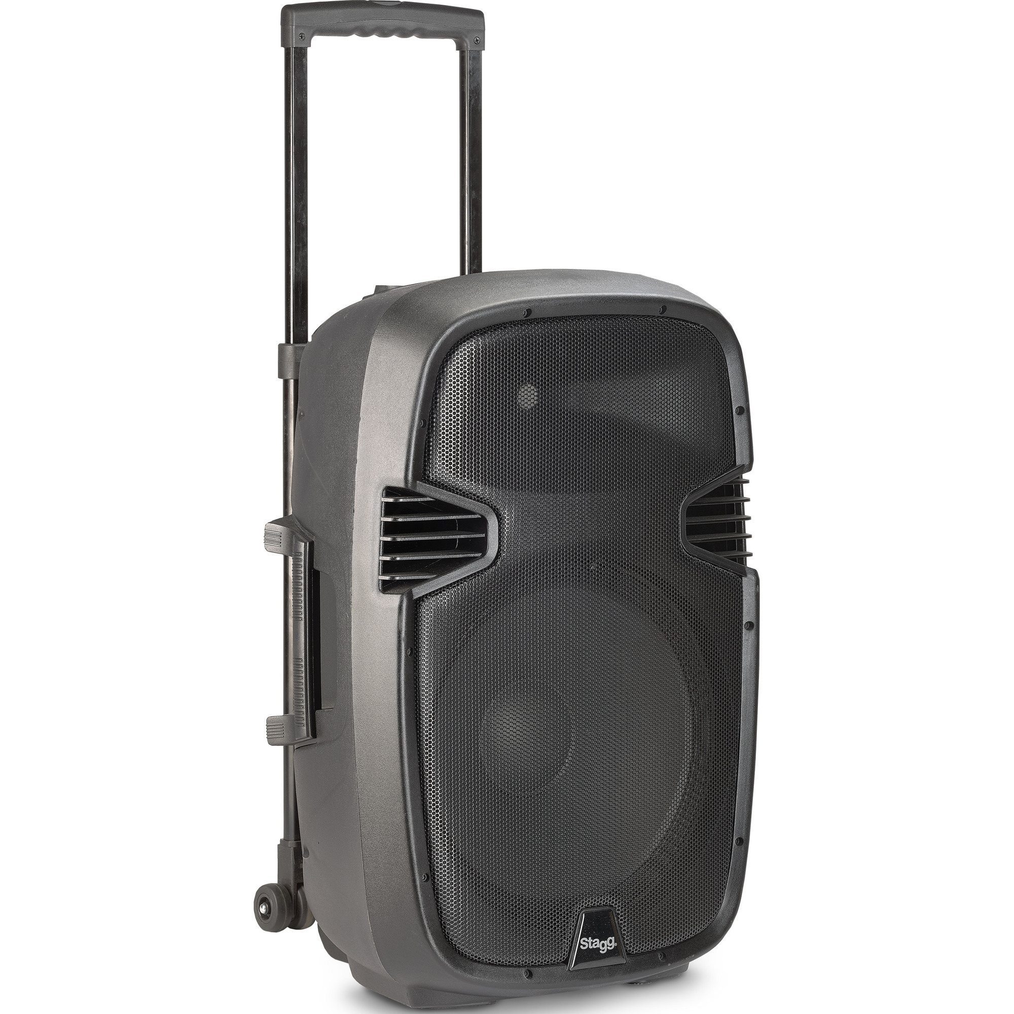 STAGG RE-VOLT15 EU – 2-полосная активная аналоговая акустическая система. В ней используется 15-дюймовый вуфер, имеющий катушку на 2 дюйма, и дюймовый драйвер с титановой диафрагмой. Оба динамика по схеме Bi-Amp подключены к усилителю, который работает в классе B и обеспечивает суммарно 200 Вт пиковой мощности. Рабочий диапазон частот варьируется от 60 до 20 000 Гц, а звуковое давление доходит до 113 дБ. Встроен перезаряжаемый аккумулятор (12 В, 7 А). Коммутационные возможности представлены микрофонным комбовходом XLR/phone джек и микрофонным входом phone джеком, линейными входами phone и Aux, а также выходом Mix на разъеме XLR. Кроме того, поддерживается подключение по Bluetooth. Разъемы находятся на задней панели, на которой еще есть регуляторы громкости микрофона, реверберации, линейного источника, общей громкости, басов и высоких частот. Также встроены переключатели VCV и Bluetooth. В корпусе имеется стакан 35 мм, благодаря которому АС можно установить на стандартную стойку, а также две точки крепления по 8 мм.