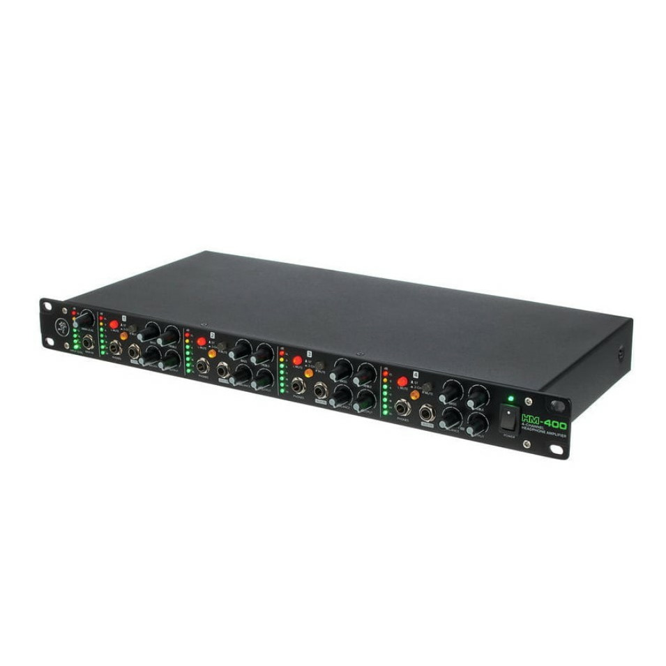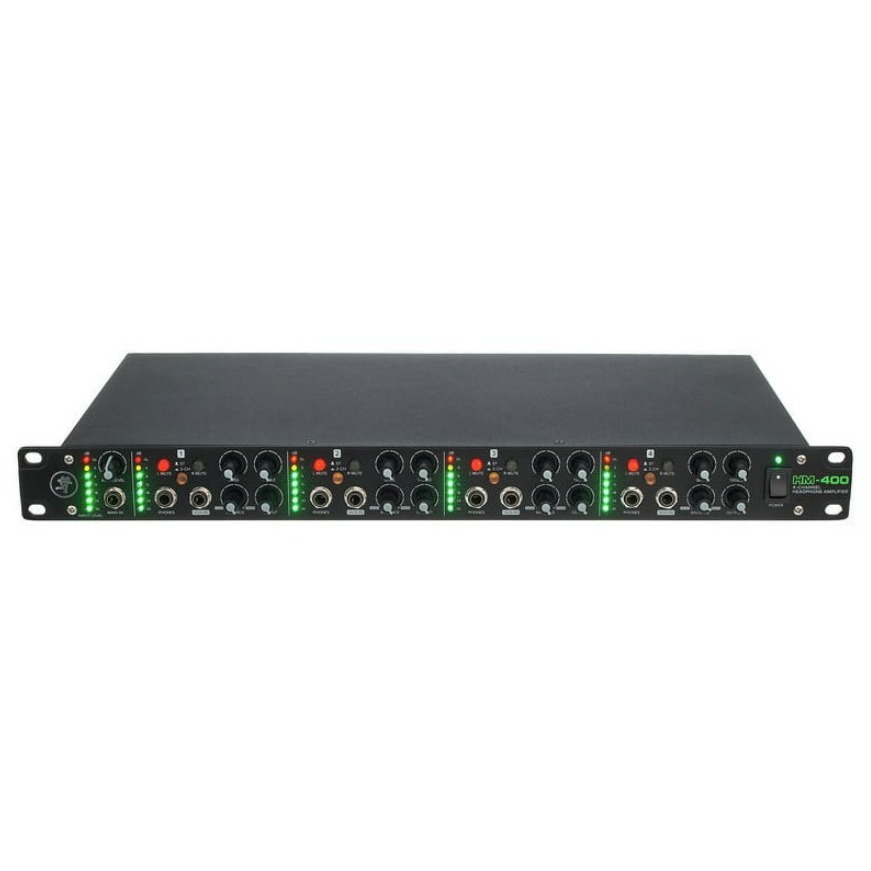 Mackie HM-400 - это компактный и удобный в использовании четырехканальный усилитель для наушников, выполненный в виде рэкового устройства. Представленная модель располагает четырьмя независимыми входными каналами и суммарно двенадцатью выходами для пользовательских наушников. То есть, используя такой усилитель, сразу несколько пользователей может контролировать звучание в своих наушниках, не прилагая при этом особых усилий. Стереофонические входы и выходы в модели расположены на разъемах TRS 1/4 дюйма Jack Aux. Также усилитель обладает семисегментной светодиодной индикацией измерения для каждого отдельно взятого канала. На фронтальной панели наличествуют переключатель Mute (для включения и выключения звука), переключатель между режимами моно и стерео, регуляторы двухполосного эквалайзера (для области высоких и низких частот), независимые регуляторы уровня выходных сигналов, а также регуляторы баланса при микшировании основного и вспомогательного сигнала. Прочный корпус усилителя изготовлен из металла и оснащен рэковым пространством (1 юнит), так что модель идеально подойдет для фиксированных инсталляций в таких помещениях, как храмы, студии звукозаписи и любые помещения для практических занятий.