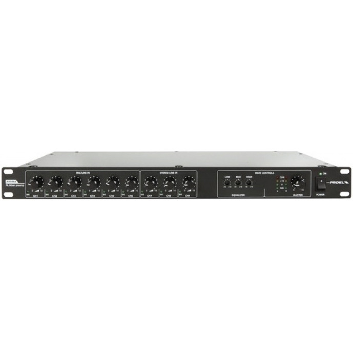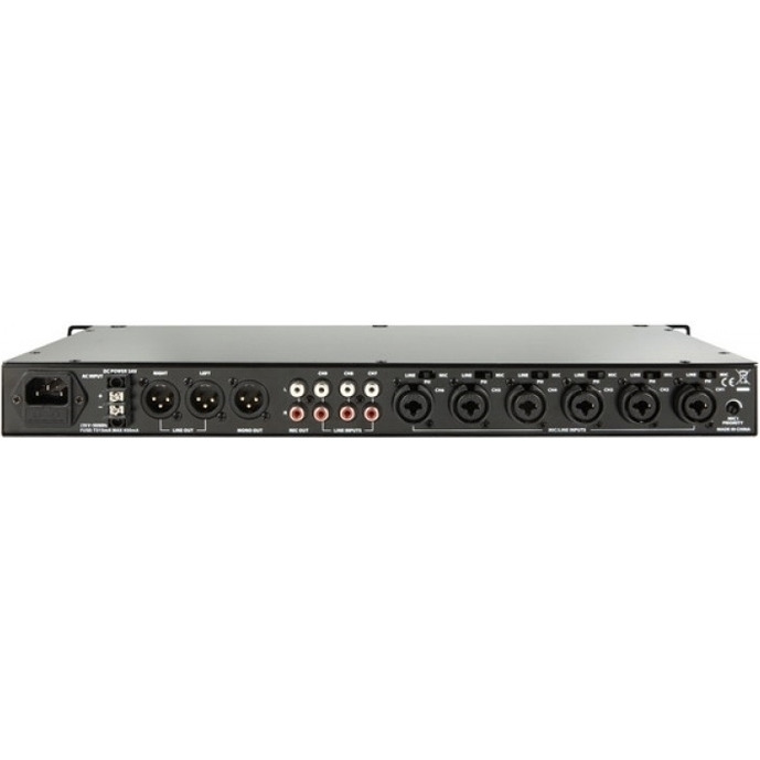 PA AMIX63 – девятиканальный стереофонический предусилитель в корпусе высотой 1U для монтажа в 19'' стойку. Имеет 6 переключаемых Mic/Line XLR входов с фантомным питанием 16–19 В и три небалансных стереовхода (2хRCA), первый микрофонный вход – приоритетный. В устройстве предусмотрен вход пожарной сигнализации.
