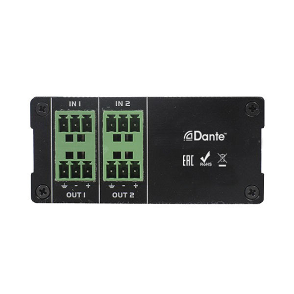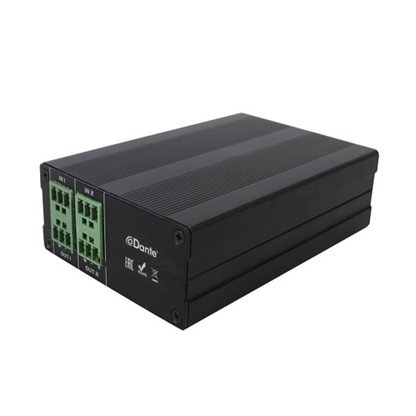 Двухканальный сетевой аудиоконвертер, обеспечивающий одновременное преобразование аналогового сигнала в цифровой с передачей по сети Dante, а также обратное преобразование цифрового сигнала в аналоговый.