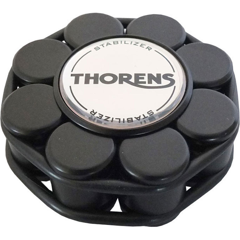 Стабилизатор Thorens улучшает контакт виниловой пластинки с диском проигрывателя, оснащенным фетровым или каучуковым матом. 8 сбалансированных грузов общим весом в 550 г. помогают исправить небольшие деформации пластинок, а так же успешно поглощают их вибрацию и резонанс. Стабилизатор поставляется в элегантной деревянной шкатулке.