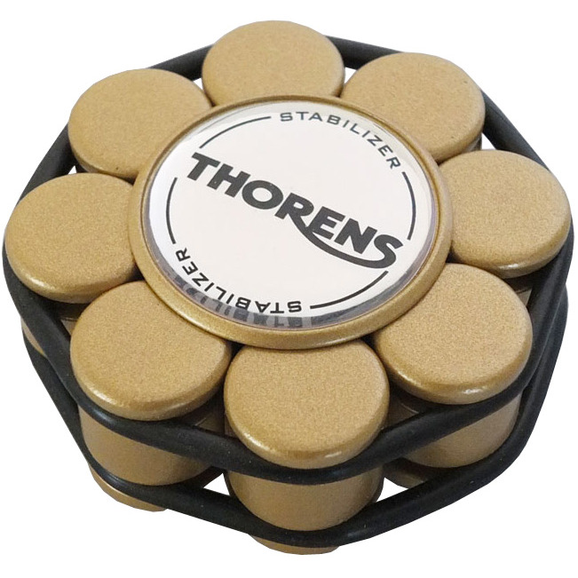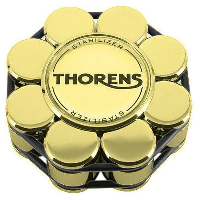 Стабилизатор Thorens улучшает контакт виниловой пластинки с диском проигрывателя, оснащенным фетровым или каучуковым матом. 8 сбалансированных грузов общим весом в 550 г. помогают исправить небольшие деформации пластинок, а так же успешно поглощают их вибрацию и резонанс. Стабилизатор поставляется в элегантной деревянной шкатулке.