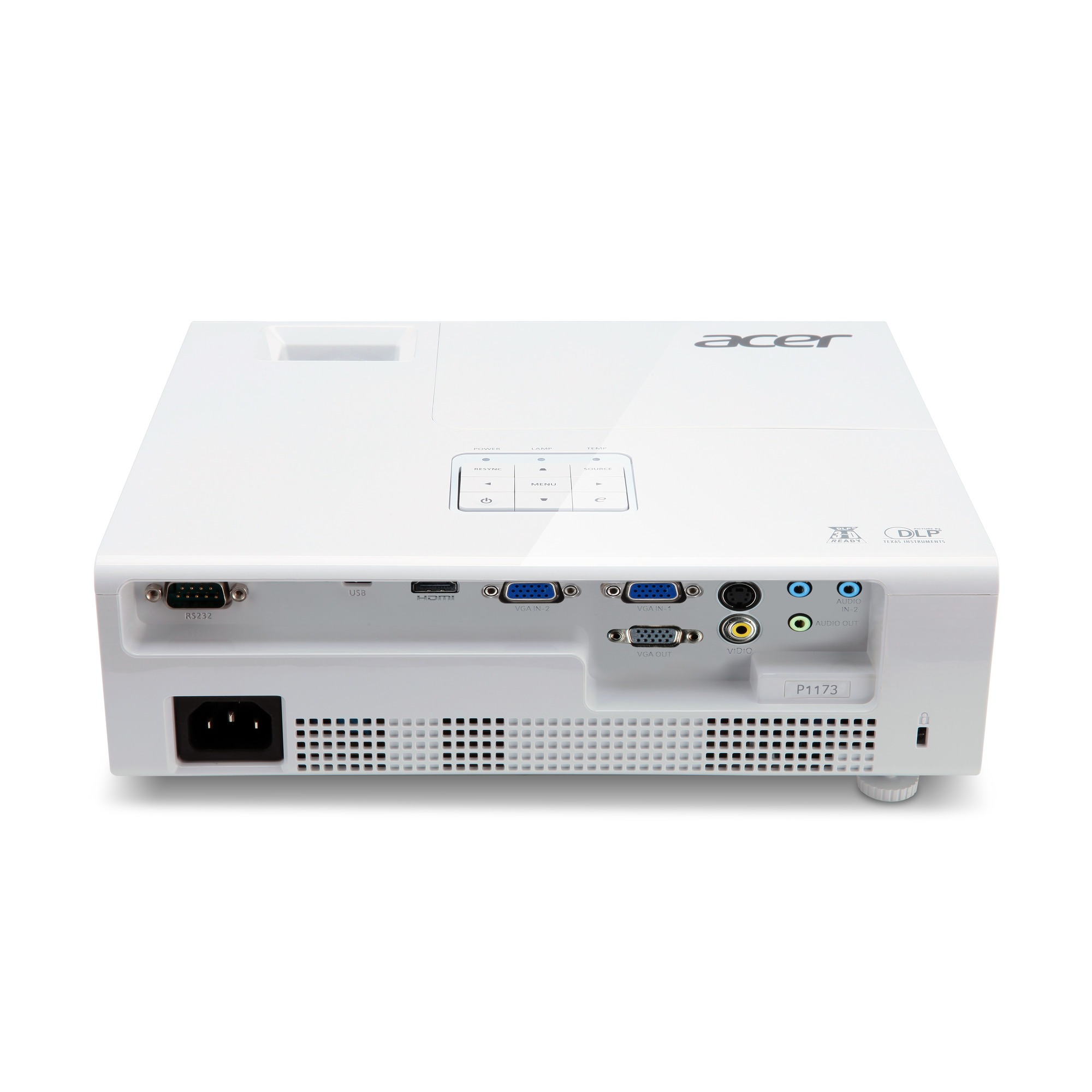 Acer P1173 - портативный проектор, технология DLP, поддержка 3D,разрешение 800x600, световой поток 3000 лм, контрастность 17000:1,подключение по VGA (DSub), HDMI, вес 2 кг.