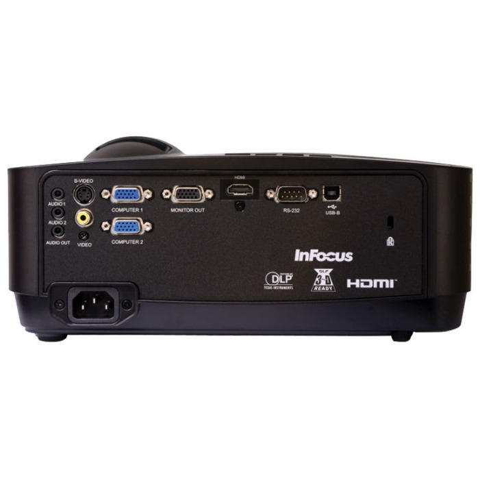 Хороший набор разъемов. Когда проектор используется в стационарной системе, к нему обычно подключают несколько источников сигнала. Если аппарат не оснащен достаточным количеством входов, приходится приобретать внешнее коммутирующее устройство, что влечет за собой дополнительные расходы. Однако при пользовании IN119HDx такой проблемы не возникнет. Проектор оснащен двумя VGA-входами, транзитным VGA-выходом для монитора, разъемами HDMI, S-Video, композитным видеовходом и аудиовходами mini-jack 3,5 мм.