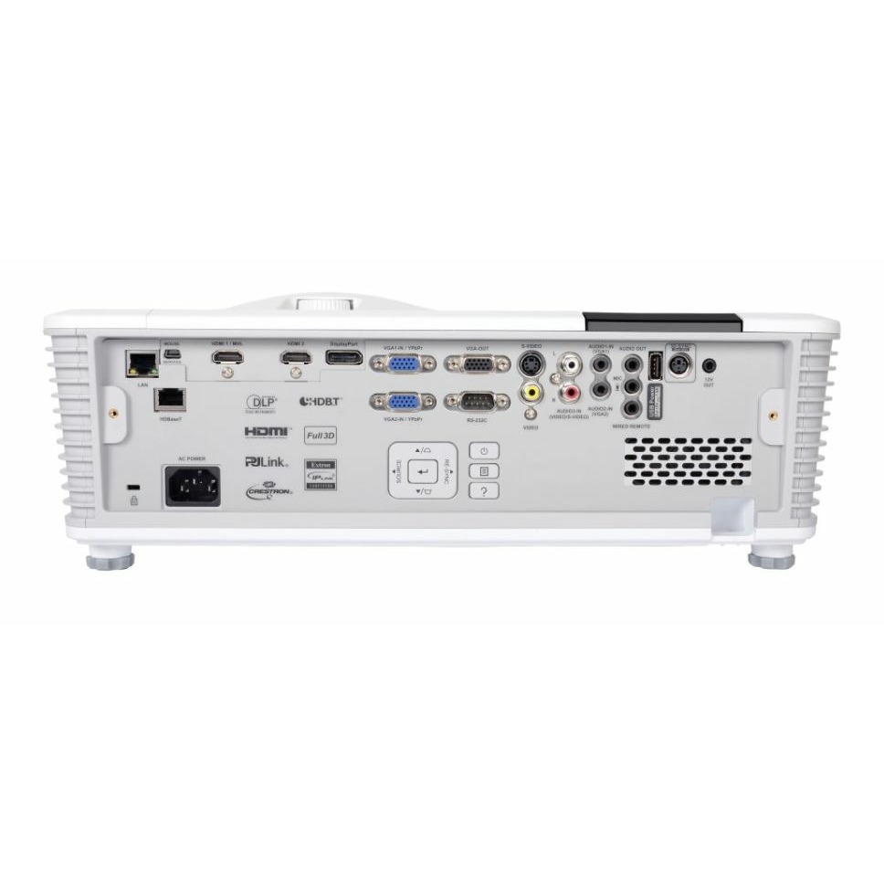 Разъемы | 1 x HDBaseT(RJ-45) 2 x HDMI (1.4a 3D) + MHL, DisplayPort, 2 x VGA (YPbPr/RGB), S-Video, композит, 3 x аудиовход (RCA/3.5 мм), Mic In, аудиовыход 3.5 мм, VGA выход, RS232, USB-A Power (1.5A), USB мышь/сервис, RJ45, 12 В триггер, 3D-Sync, проводной пульт ДУ |