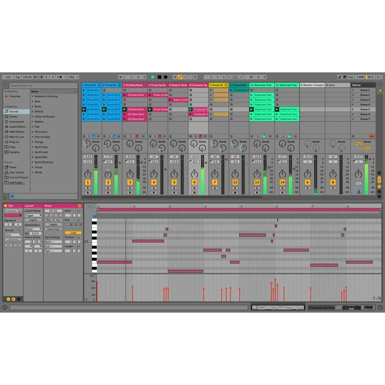 В версии Suite достаточно инструментов и тембров, чтобы заниматься аранжировкой, композицией и сведением, не пользуясь сторонними плагинами. Внутренняя библиотека насчитывает 70 Гб аудиоматериала для любых жанров и 55 инструментов пространственной, динамической и спектральной обработки. DAW работает с любыми MIDI-контроллерами, а гибкий маппинг позволяет назначать элементы интерфейса и функции программы на любую клавишу или регулятор. Live может работать и с полностью аналоговыми инструментами по CV (при наличии DC-coupled аудиоинтерфейса).