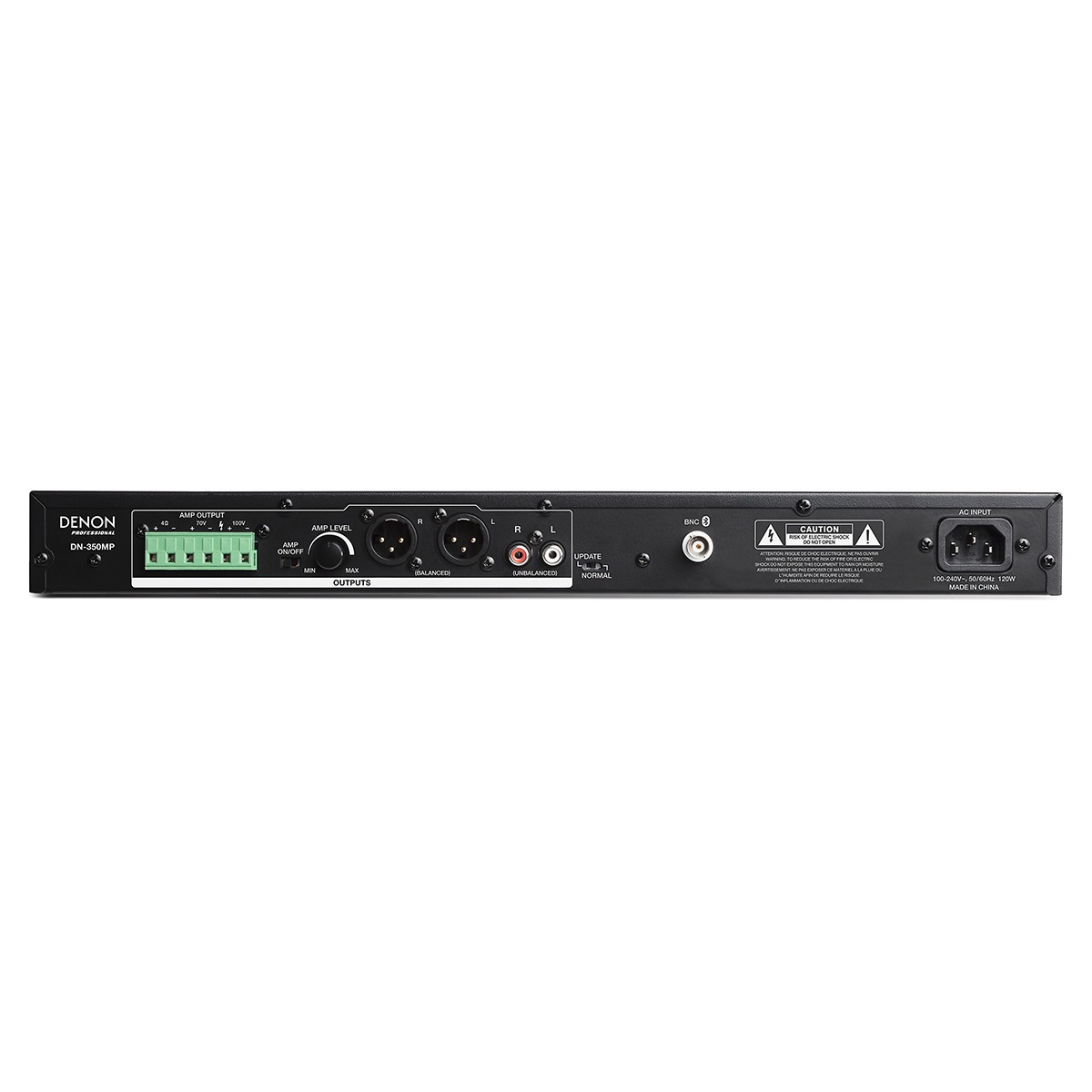 Denon DN-350MP способен запоминать до 8-ми Bluetooth устройств, и предоставляет возможность подключения антенны через специальный BNC разъем. Проигрыватель оснащен встроенным моно-усилителем мощностью 60 Вт, регулятор громкости и кнопка включения которого находятся на задней панели. Усилитель подключается к 4-омным, 70- и 100-вольтным акустическим системам через разъем Euroblock.