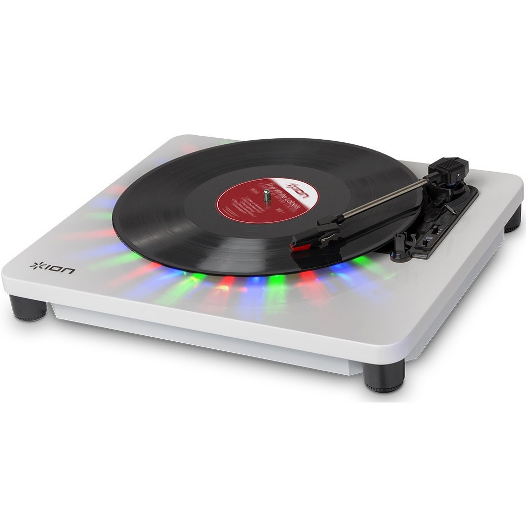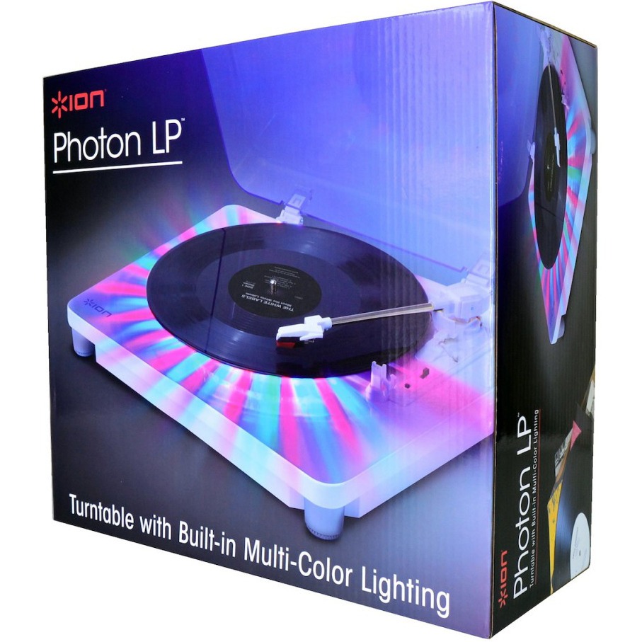 ION Audio PHONTON LP поднимает музыкальный градус. Виниловый проигрыватель PHONTON LP имеет многоцветную светодиодную подсветку для создания праздничной атмосферы, стильный белый корпус, функцию оцифровки и возможность подключения по USB к любому компьютеру.