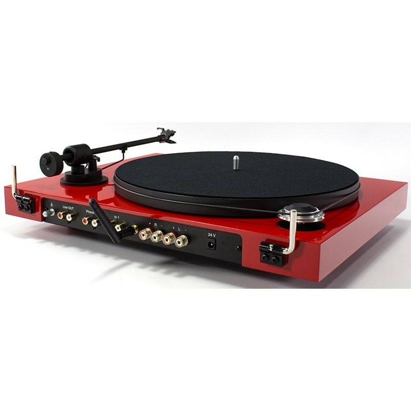 Опорный диск в Pro-Ject Juke Box E выполнен из ДВП, имеет диаметр 300 мм и оснащен фетровым матом. Диск опирается на стальной подшипник, и приводится в движение с помощью силиконового пассика. Переключение скоростей 33 / 45 оборотов производится вручную. Все клеммы на задней панели Juke Box E позолоченные и общее качество изготовления проигрывателя очень высокое, что редко встречается у моделей данной ценовой категории. Аппарат выполнен с учетом всем требований, которые предъявляются к проигрывателям винила класса Hi-Fi, и его универсальность не была принесена в жертву качеству звука. При подключении небольших колонок хорошей чувствительности Juke Box E способен озвучить комнату средних размеров. Аппарат выпускается в черной или белой лаковых отделках и комплектуется акриловой пылезащитной крышкой. Если вы думаете, что система для прослушивания винила обязательно должна быть сложной и дорогой – попробуйте Pro-Ject Juke Box E!