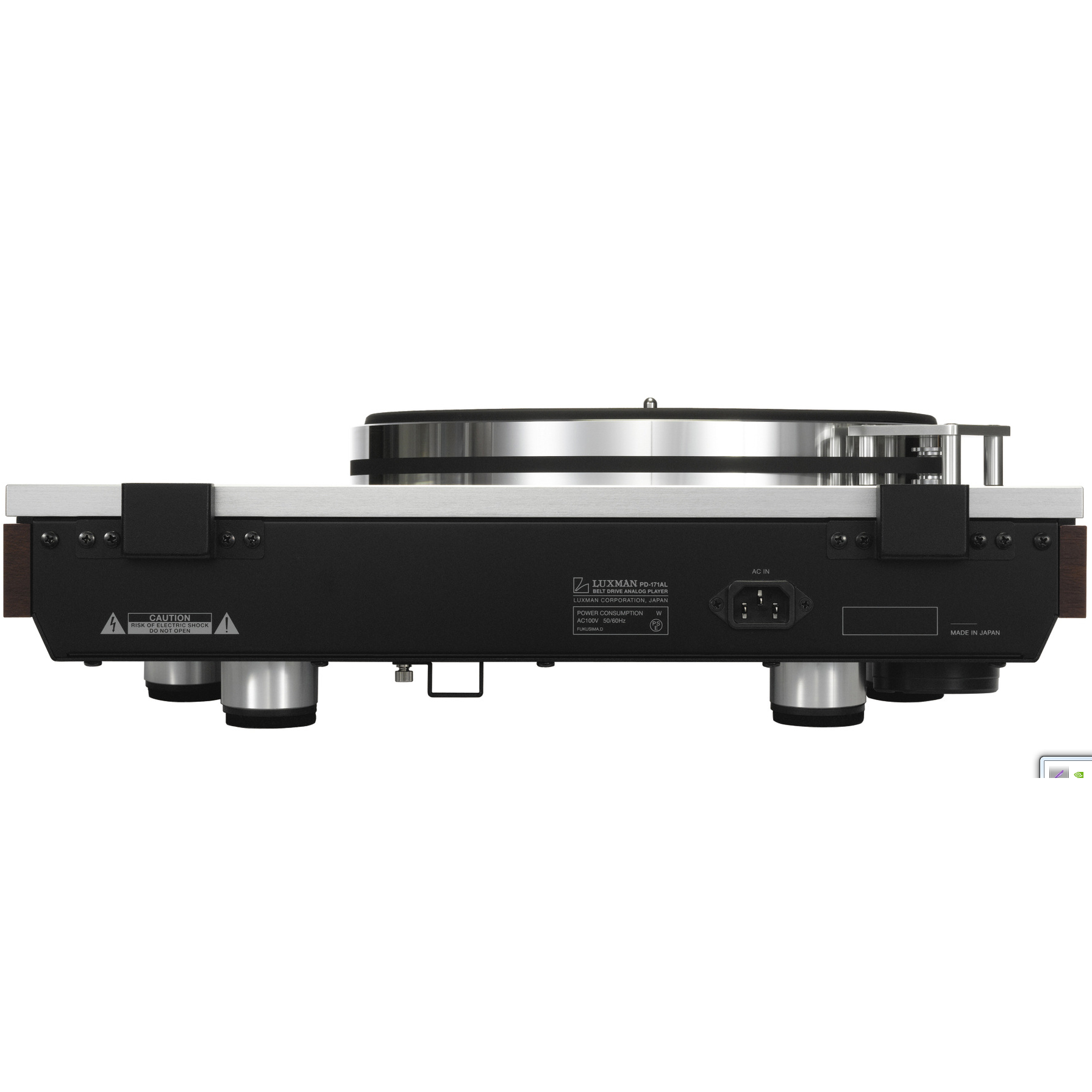 Качественная сборка и добротный классический дизайн этого аппарата весом в 23 кг впечатляют. Алюминиевое основание проигрывателя «одето» в декоративную рамку, сделанную из ценной породы дерева. Опорой служат четыре регулируемые ножки сложной конструкции. Верхняя часть представляет собой алюминиевую панель толщиной в 15 мм. Основной неинвертированный тефлоновый подшипник не требует частой смазки. На его шпиндель надевается изготовленный из алюминия опорный диск весом в 5 кг. Сверху крепится резиновый мат. В комплекте предусмотрены вкручивающиеся в этот диск ручки-держатели, что делает его установку легкой и удобной. На верхней панели находится кнопка питания, клавиша включения двигателя Start/Stop, селектор скоростей, оригинальный экран стробоскопа с LED-подсветкой, который вместе с расположенными правее двумя ручками настройки позволяет точно отрегулировать скорости вращения (33,3 или 45 об/мин). Несколько необычно выглядит расположенный рядом с клавишей Start/Stop металлический стержень с оранжевым светодиодом подсветки, с помощью которого даже в полной темноте можно легко найти нужную дорожку на пластинке. Luxman PD-171AL использует синхронный электромотор переменного тока с высоким крутящим моментом, укротить который помогает специальный электронный контур, построенный на основе микропроцессора. Двигатель сообщается с опорным диском посредством прочного плоского пассика, который менее склонен к проскальзыванию, чем обычные пассики с круглым сечением. Шкив мотора прикрыт колпаком. Имеется акриловая пылезащитная крышка.