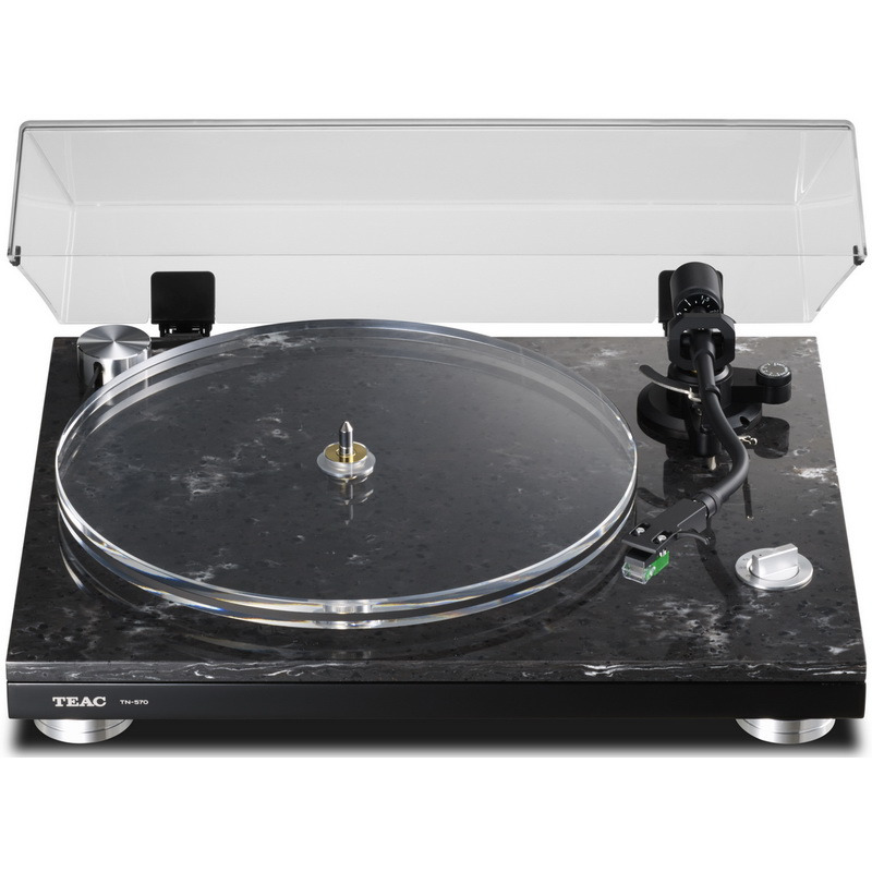 Teac TN-570 проигрыватель виниловых дисков со встроенным фонокорректором базируется на двухслойном шасси из искусственного мрамора и MDF высокой плотности - такое сочетание прекрасно справляется с внутренними резонансами, добавляя свое слово в чистоту звука. В этой модели использована собственная разработка компании - система стабилизации скорости вращения (PRS3), которой оснащен пассиковый привод диска. Таким образом скорость поддерживается на прецизионном уровне - как у прямого привода. На оптический цифровой выход поступает сигнал с разрешением до 192кГц/24-бит - благодаря встроенному фонокорректору Phono EQ (MM type) и АЦП. На USB-порт проходит сигнал 48кГц/16-бит. С выходом TEAC TN-570 у меломанов появилось больше возможностей в прослушивании аналоговых аудио источников благодаря использованию как цифровых, так и чисто аналоговых технологий. Теперь пользователь с легкостью может записать музыку на компьютер, работать с разными цифро-аналоговыми преобразователями и системами воспроизведения, не переживая за качество звучания. Дело в том, что цифровые схемы в TEAC TN-570 тщательно экранированы, а вибрации от мотора к шасси гасятся благодаря каучуковому подвесу. В то же время плоский полиуретановый пассик подвержен минимальному вытяжению и надежно передает вращение на акриловый диск. Стоит отметить, что акриловый диск, толщиной 16 мм, отличается высокой степенью прозрачности и прекрасно дополняет массивную мраморную плиту, которая весит 9 кг. Проигрыватель TEAC TN-570 относится к тем, которые очень легко настраиваются и практически готовы к работе после распаковки - он сразу оснащен головкой звукоснимателя Audio-Technica AT100E (MM типа) и имеет статически сбалансированный S-образный тонарм, а соединительный кабель изготовлен из меди самого высокого качества PC-Triple C (Pure Copper-Continuous Crystal Construction). Шелл совместим с картриджами других компаний и типов. Встроенный фонокорректор - большое облегчение для пользователей, которые располагают усилителями без phono-входа. Они используют операционные усилители NJM8080 (производитель New Japan Radio Company), гарантируя превосходное качество с минимальными искажениями и без потерь. USB-порт основан на АЦП Texas Instruments, который обеспечивает PCM сигнал CD-качества (48кГц/16-бит макс.). Пользователь может создать цифровой архив, переписав ценные виниловые пластинки на жесткий диск или CD-R. На оптический цифровой выход поступает сигналы с частотой дискретизации 192 кГц, 96 кГц или 48 кГц разрядностью 24-бит.