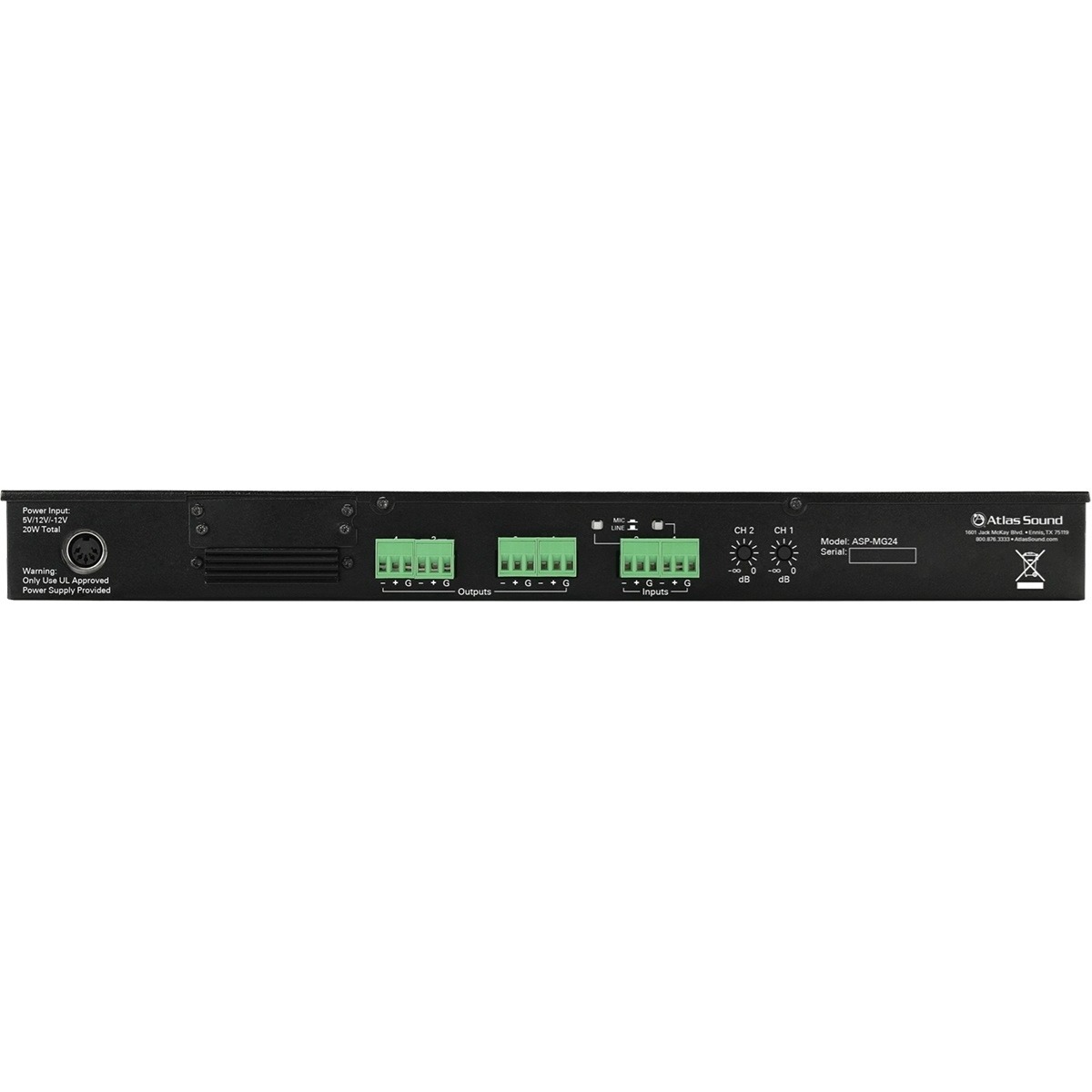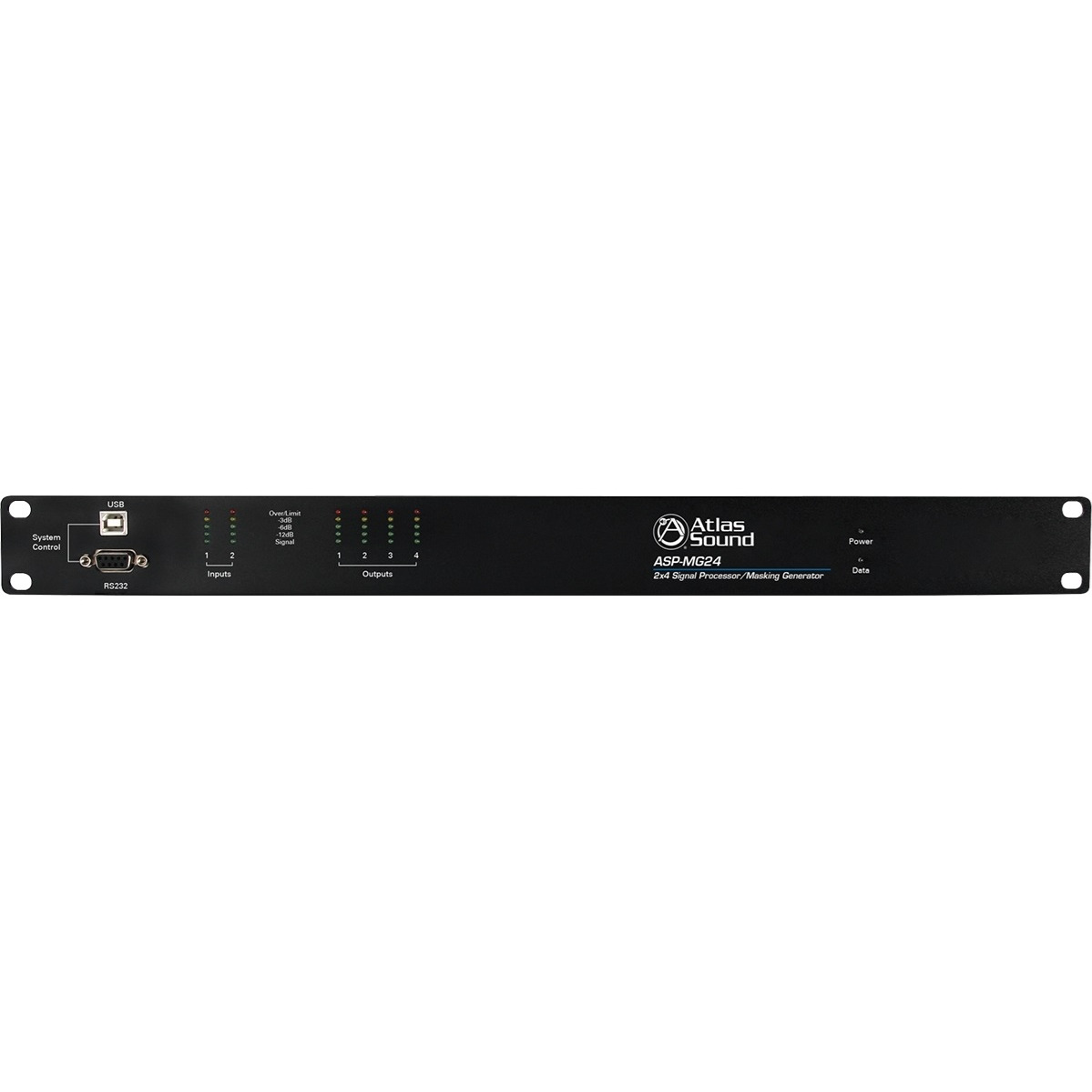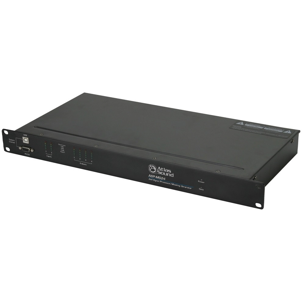 Atlas IED ASP-MG24 – маскирующий процессор/контроллер акустических систем, 2 входа и 4 выхода, импеданс входа 10 кОм и выхода 50 Ом в балансном режиме, максимальное напряжение входа и выхода +20 дБu, частотная характеристика 20 Гц – 20 кГц (±0,1 дБ), 4 внутренних генератора белого/розового шума, управление от ПК по интерфейсам USB, RS-232 и Ethernet, специальное ПО.