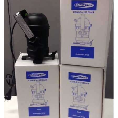 Showtec CDM Par 35 Black - прожектор PAR 35, предназначенный для эксплуатации в сухих, мало запылённых, помещениях. Предполагается установка лампы-фары с цоколем E27 с максимальной мощностью 45Вт. Охлаждение естественное. Питание осуществляется от стандартной электросети, кабель 0.3 м с разъёмом Schuko прилагается. Также прилагается рамка под светофильтры. Корпус выполнен из металла и противопожарного пластика. Showtec CDM Par 35 Black обладает следующими преимуществами: чрезвычайно длительный срок службы лампы (9000 часов), защита от УФ-излучения, хорошая цветопередача (цветопередача 83% при 3000 ° Кельвина) и рама цветного фильтра.