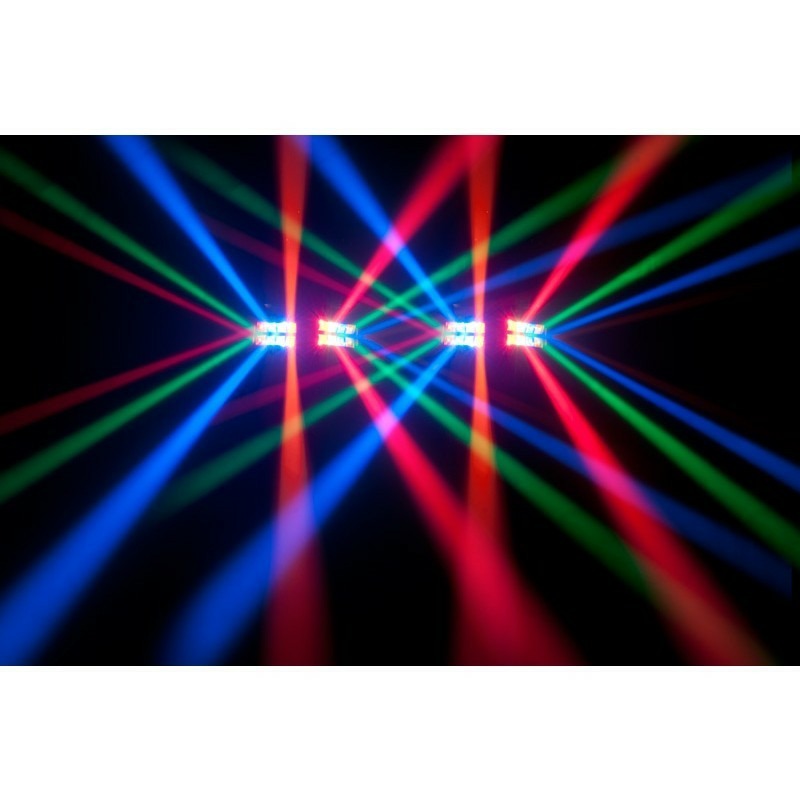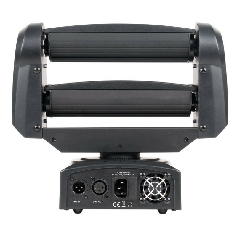 - | Вращающаяся голова с динамичными чейзами 8-секционных светодиодов RGBA c двух светодиодных штанг по 4 линзы каждая с независимым движением |