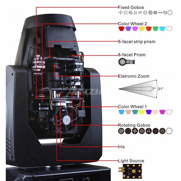| 2 колесо гобо | 7 вращающихся гобо рисунков + открытый, вращение колеса гобо по и против часовой стрелке, эффект тряски |