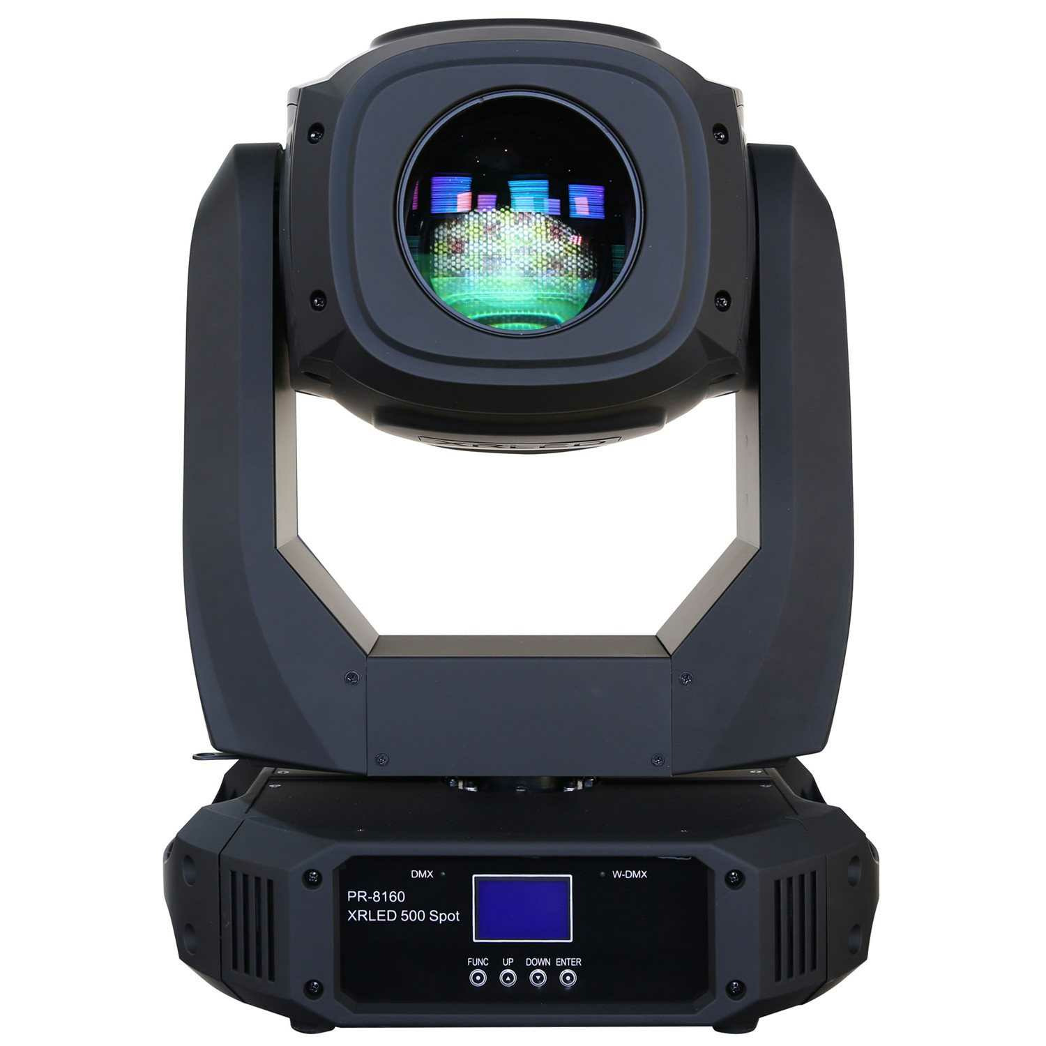 XRLED 500 Spot это новый прибор полного вращения в котором в качестве источника света применен белый светодиод, мощностью 150Вт. Прибор располагает двумя колесами гобо, и имеет 7 статичных гобо + 7 вращающихся индексируемых и вращающихся гобо. Колесо цвета имеет 8 цветных дихроичных фильтров + открытую позицию. Угол раскрытия луча варьируется в пределах от 14 до 30 градусов. Также имеется трехгранная призма, ирисовая диафрагма, плавный диммер 0-100%, строб-эффект 0,3-25 всп/сек. Прибор обладает функцией беспрерывного и неограниченного движения по Pan, что позволяет получать особенные эффекты при вращении. XRLED 500 Spot оснащен беспроводным приемником DMX-сиганала.