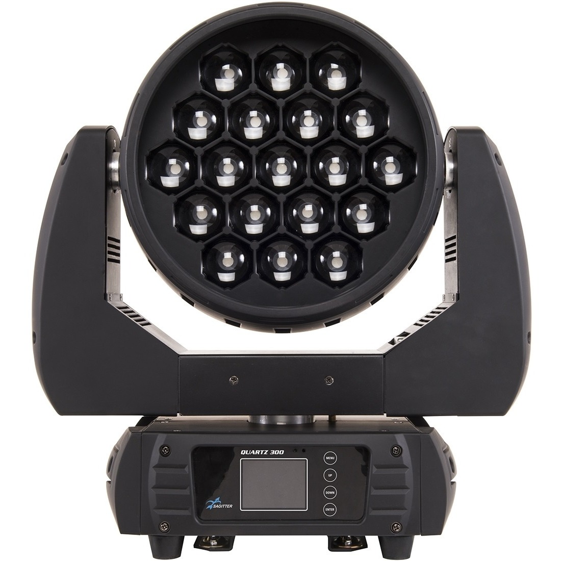 SG QUARTZ300 – прибор полного движения c девятнадцатью RGBW-светодиодами по 15 Вт каждый. Характеризуется освещенностью до 8600 лк на расстоянии 5 метров при угле раскрытия луча 8°, имеет изменяемый угол раскрытия луча от 8° до 62°. Есть три режима управления – 14, 20 или 92 DMX-канала. В режиме стробоскопа выдает до 20 вспышек в секунду.