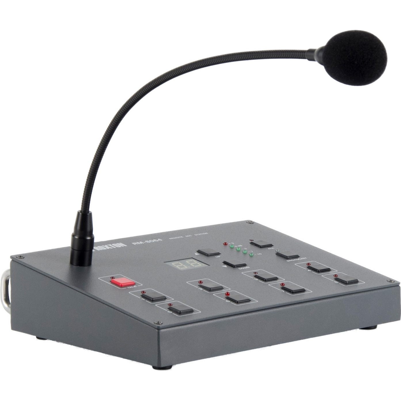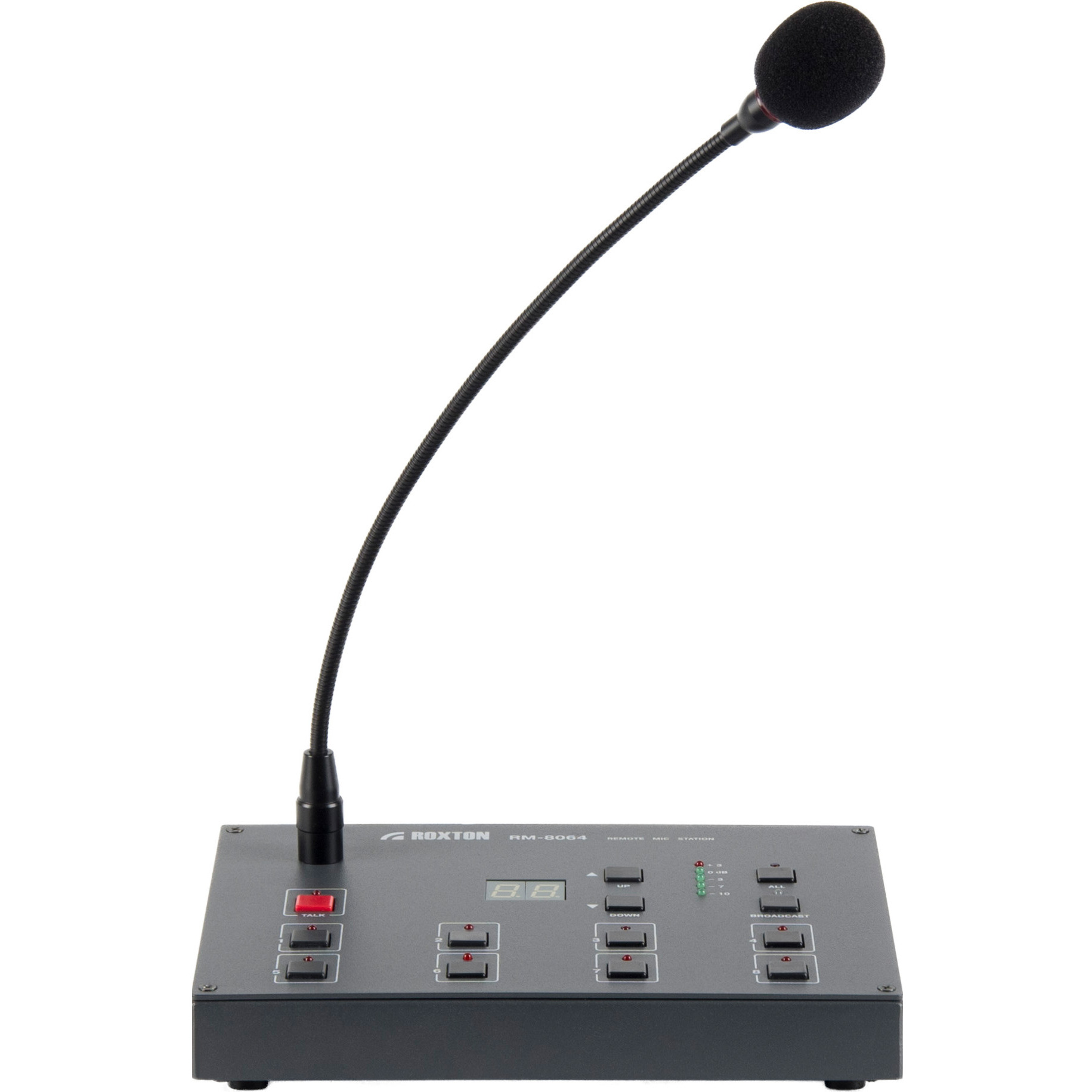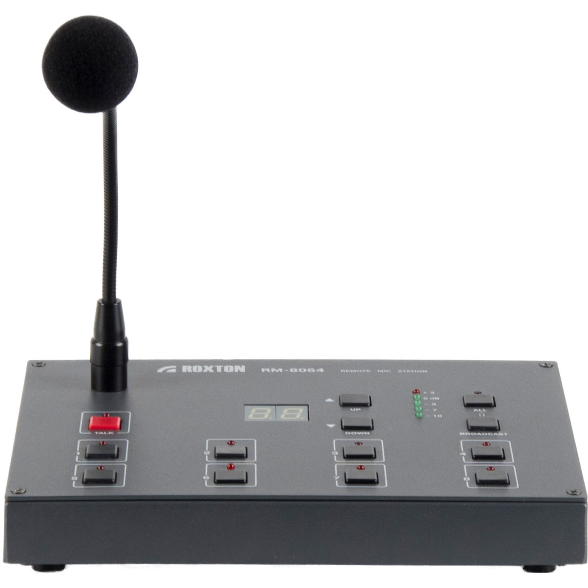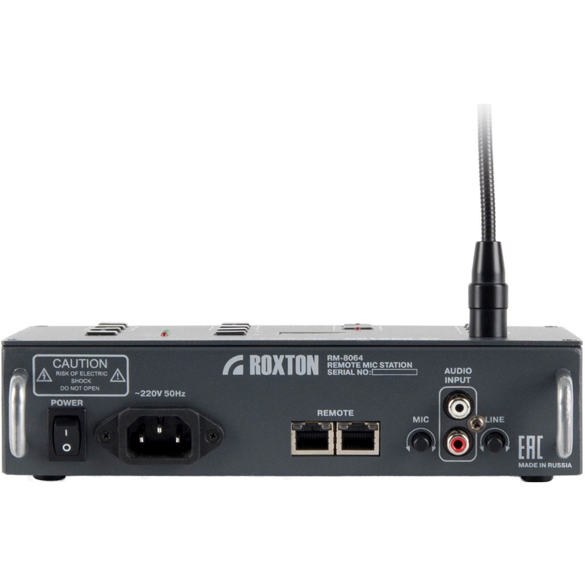 Микрофонная консоль ROXTON RM-8064 предназначена для дистанционного управления комбинированной ситемой RA-8236. Консоль работает как в составе локальной системы, так и в составе общей (распределенной) системы, совместно с процессором-селектором ROXTON PS-8208. Микрофонная консоль - это устройство, совмещающее в себе функции селектора зон и микрофона, предназначена для выбора нужных зон (до 512 зон) и передачу в них речевого сообщения с микрофона, а также с музыкального аудио входа, расположенного на задней панели. При помощи консоли можно осуществлять дистанционное управление 64-мя блоками RA-8236, с целью дальнейшей коммутации в заданном приоритете. Основные функции консоли ROXTON RM-8064: