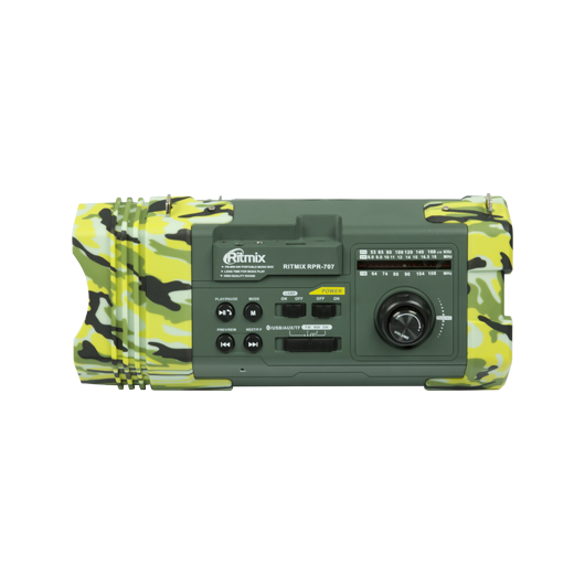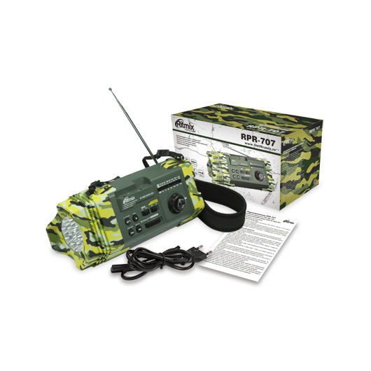 Ritmix RPR-707 — портативный радиоприёмник, работающий на трёх диапазонах, включая FM. Дополнительная функция RPR-707 — воспроизведение MP3-файлов с карт памяти microSD или USB-флэшки, а также беспроводное воспроизведение по Bluetooth. Устройство оснащено ярким светодиодным фонарём и удобным ремнём для переноски.