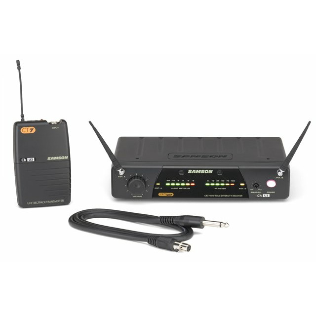 SAMSON Concert 77 Guitar E1 - является отличной беспроводной системой, где необходима свобода передвижения, обеспечивает профессиональный звук Вашей гитары в любом месте. CT7 — это поясной передатчик системы Samson Concert 77 Guitar System, который пристегивается на гитарный ремень. Три-сегментный индикатор батареи, аудио выключатель с регулируемым уровнем AF (усиление звука), CT7 обеспечивает 12 часов автономной работы от одной 9-вольтовой батареи. Приемник имеет удобный светодиогдный дисплей на передней панеле. PLL схемы управления частотой отлично держат сигнал. На задней панели есть балансовый XLR и несбалансированный 1/4-дюймовый выходы.