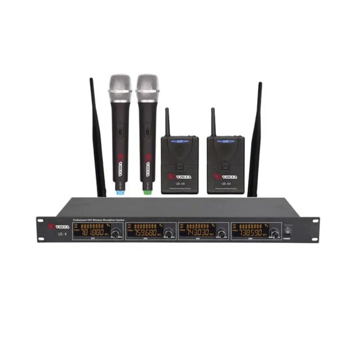 VOLTA US-4X Микрофонная радиосистема с двумя ручными и двумя головными микрофонами UHF диапазона с фиксированной частотой. LCD-дисплей, True Diversity, Plug&play.