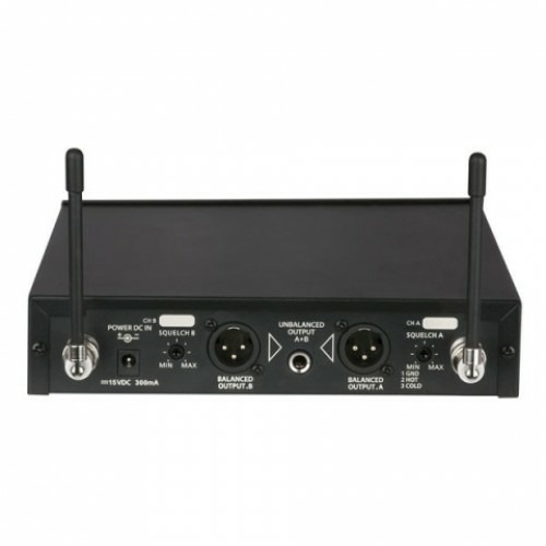 • Приёмник. С функциями микшера. 2-х канальный. В приёмнике предусмотрены антенны каналов А, В, LCD дисплей с кнопками назначения каналов радиосвязи и индикацией канала, несущей частоты, AF и RF, IR LED контроля приёма/передачи, переключатель электропитания On/Off, канальные регуляторы уровней А, В, вход с блока питания 15 В 300 мА, канальные регуляторы шумоподавления А, В, канальные балансные выходы XLR А, В, микшированный небалансный выход ¼˝ TRS.