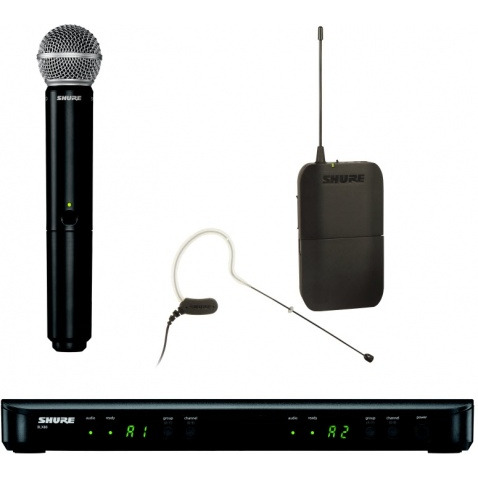 В систему входят: двухканальный приемник BLX88, компактный поясной передатчик BLX1, миниатюрный всенаправленный микрофон с заушным креплением MX153 и ручной передатчик BLX2/SM58. В комплекте поставляется блок питания и держатель для микрофона SM58.