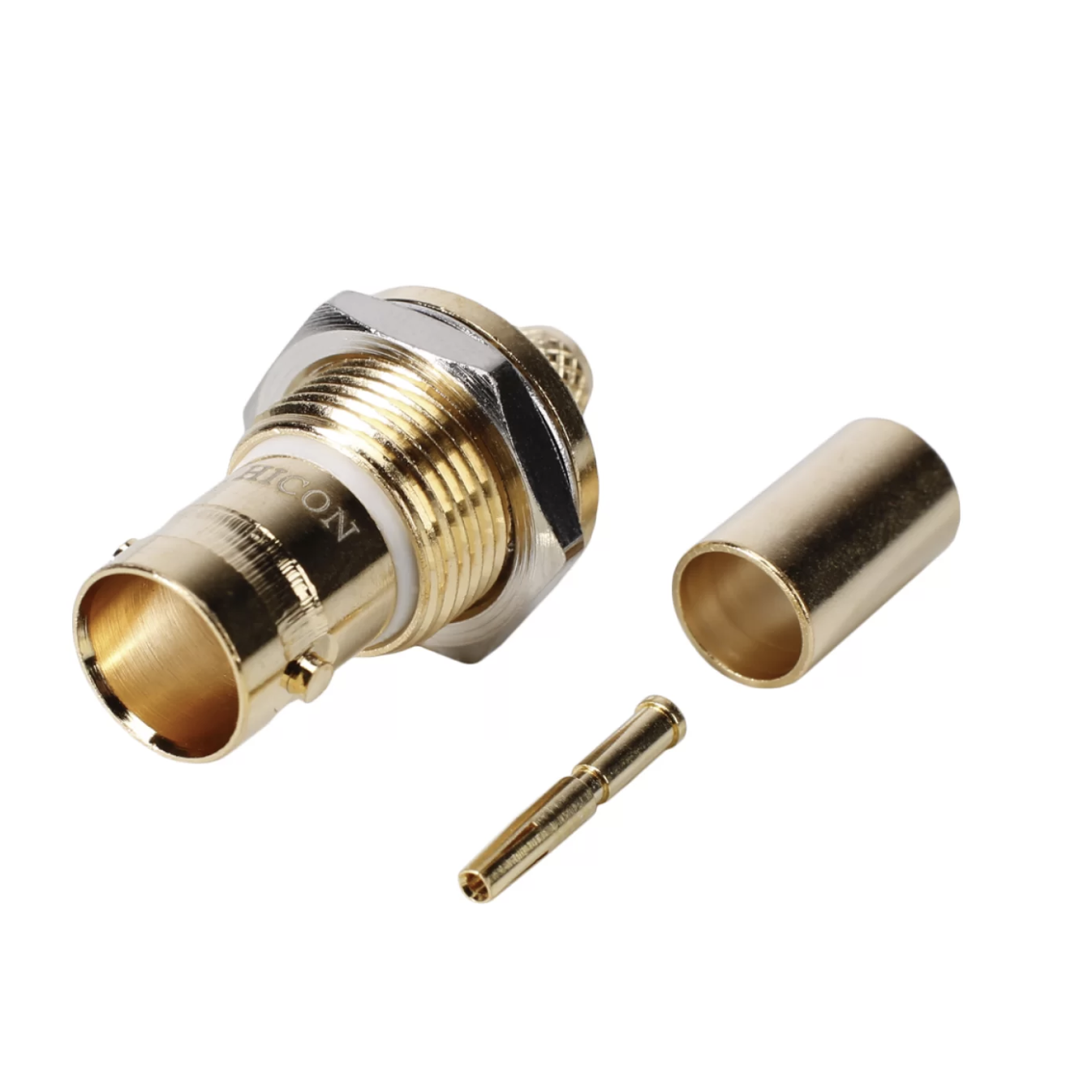 Разъем HICON BNC 0.8/3.7 3G-SDI 75 Ом, гнездо на панель, позолоченные контакты под обжим, количество контактов: 2, металлический металлический корпус, байонетное соединение, изоляция массы